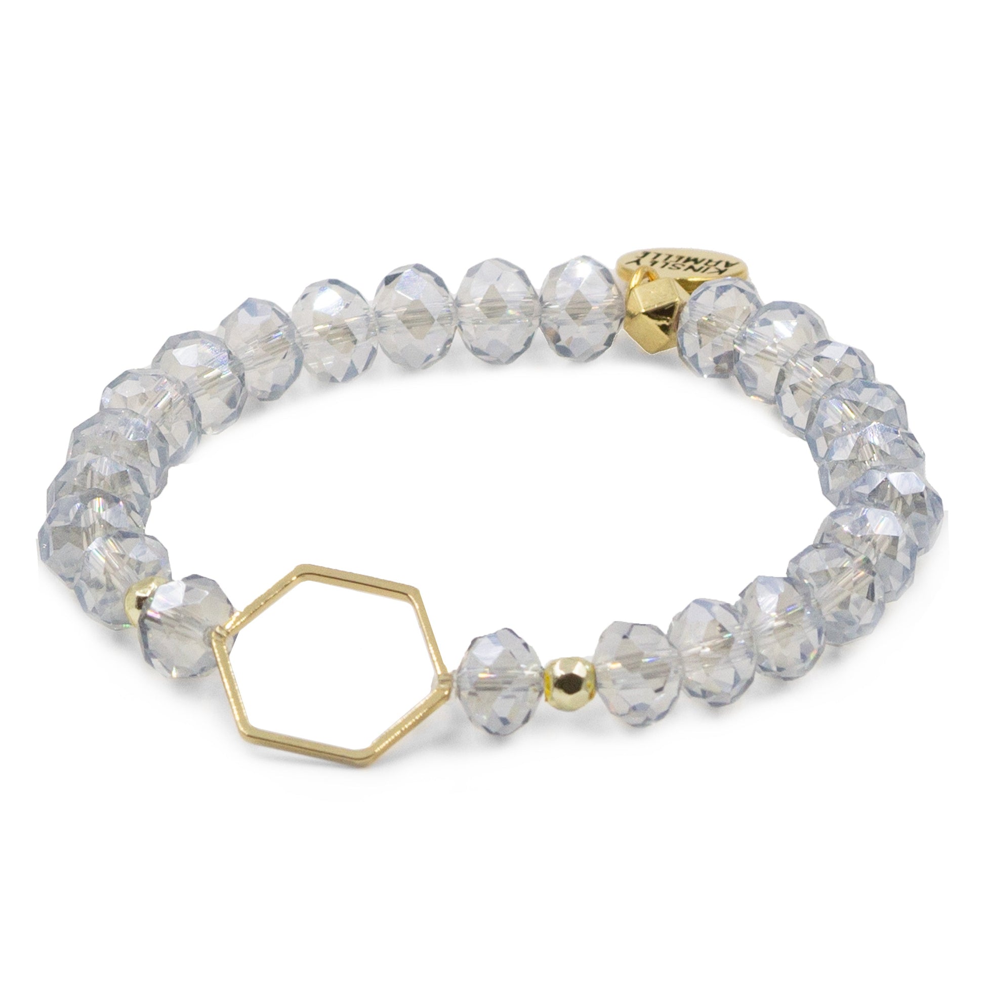 Gold And Blue Faceted Geometric Hypoallergenic Nickel Free Beaded Stretch Bracelet. Custom 18K Yellow Gold Plated Brass Geometric Shapes Accents And Designed With Love In Texas. Size Small, Medium, Large, and Extra Large Ranging From 6.25 - 7.25 Inch Circumference With Custom Sizing Available On Select Pieces.