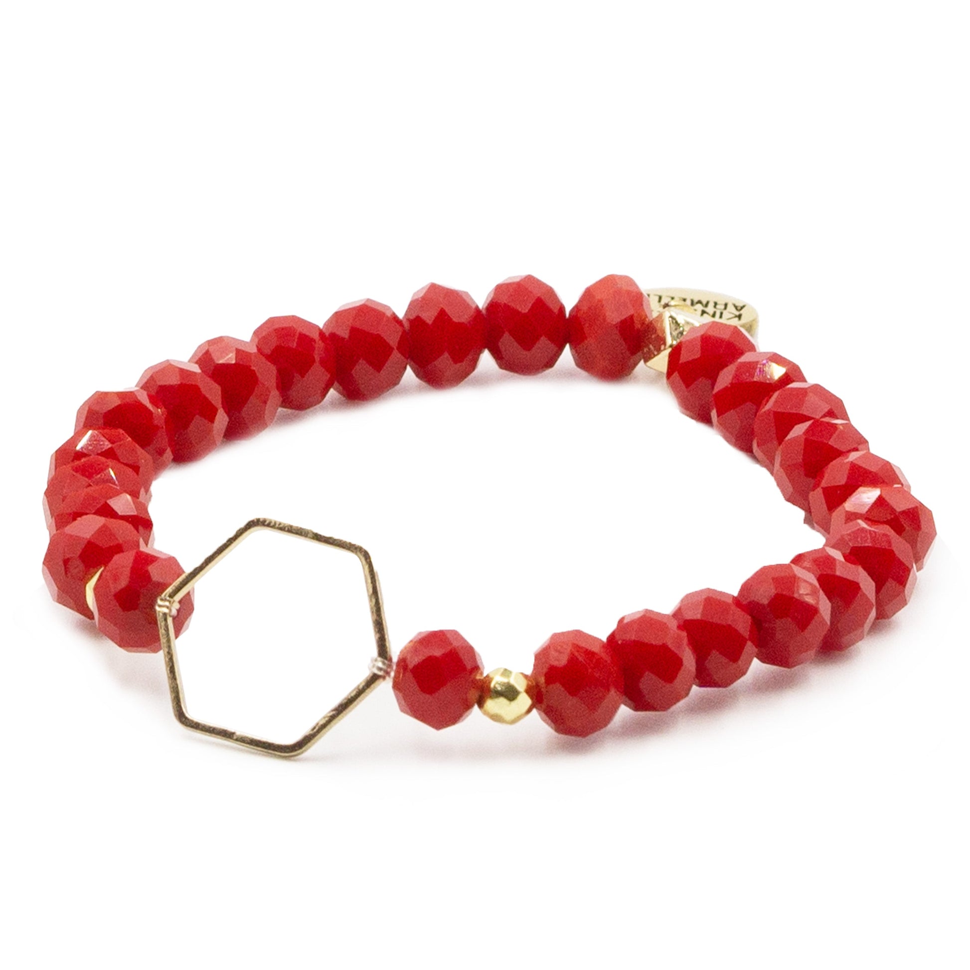 Gold And Red Faceted Geometric Hypoallergenic Nickel Free Beaded Stretch Bracelet. Custom 18K Yellow Gold Plated Brass Geometric Shapes Accents And Designed With Love In Texas. Size Small, Medium, Large, and Extra Large Ranging From 6.25 - 7.25 Inch Circumference With Custom Sizing Available On Select Pieces.