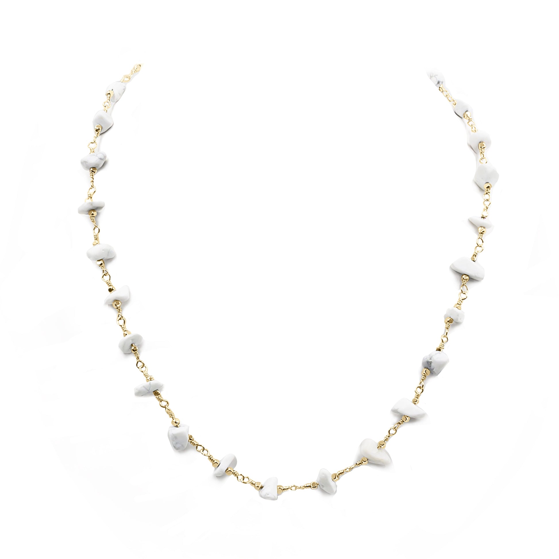 Gold And White Natural Stone Nugget Station Hypoallergenic Nickel Free Choker Necklace. Custom Howlite Raw Natural Stone Accents And Designed With Love In Texas. Size 14 or 18 Inch Length, Plus 3 Inch Attached Necklace Extender With Custom Sizing Available On Select Pieces.