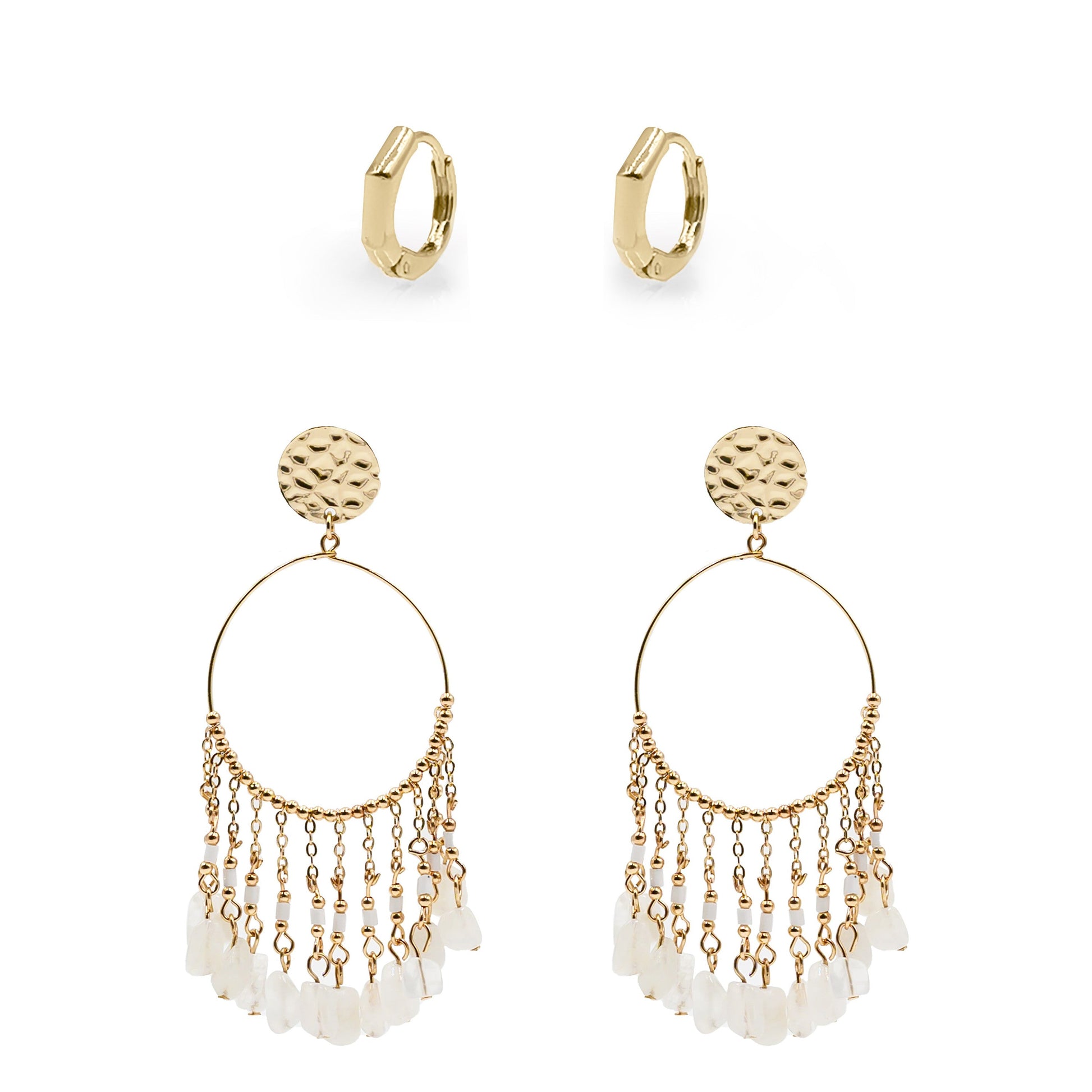 Gold And White Boho Drop Fringe Hexagon Huggie Pave Stud Featherweight Hypoallergenic Nickel Free Dainty Earring Stack Set. Custom Druzy Raw Natural Quartz Stone Accents And Designed With Love In Texas. Size Goddess Collection - Omega Earrings: 1cm Length x 1cm Width | Sofie Collection - Perla Earrings: 3.5 Inches Length x 1.5 Inches Width With Custom Sizing Available On Select Pieces.
