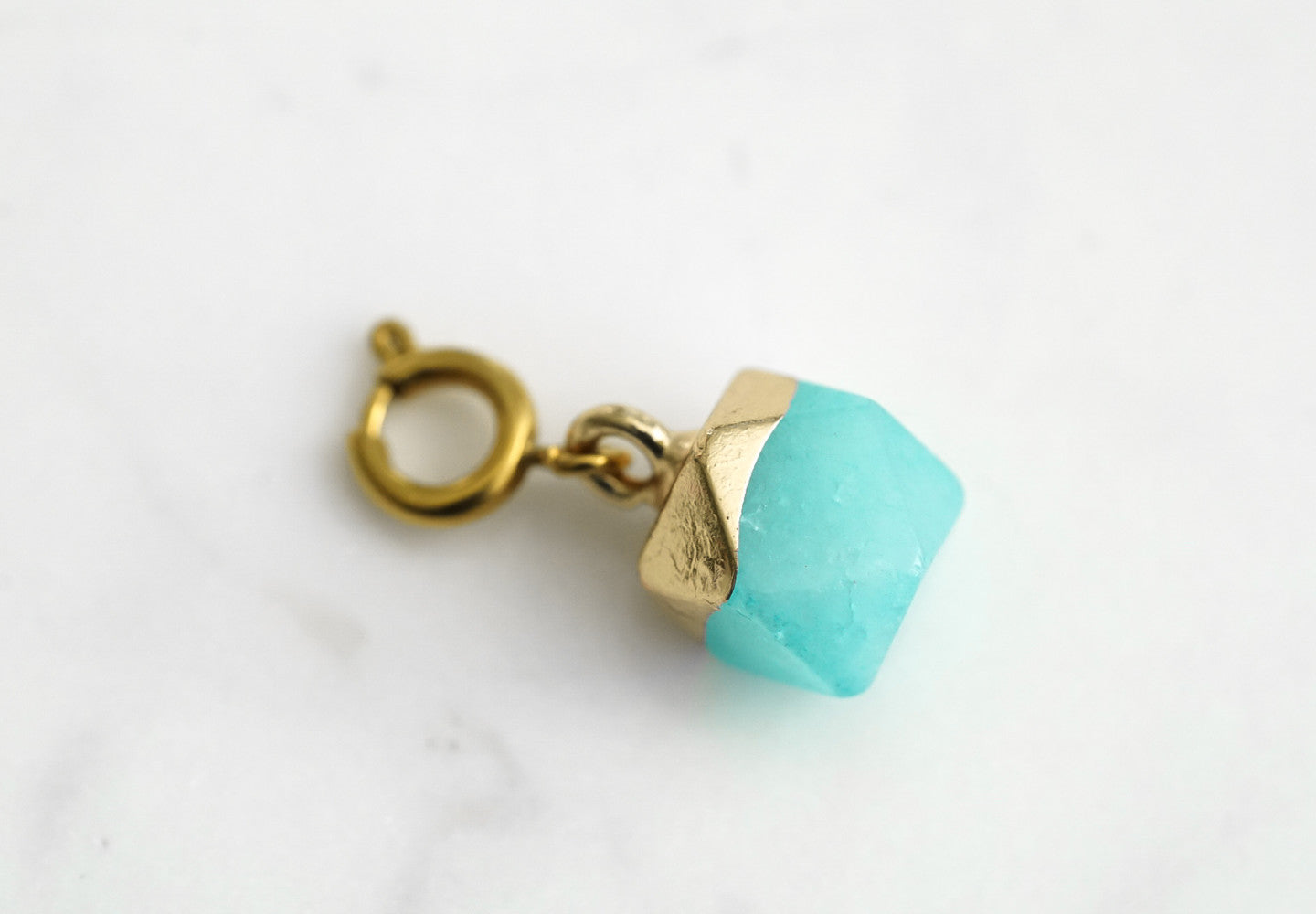 Gold And Light Blue Geometric Icosahedron Natural Stone Crystal Gemstone Hypoallergenic Nickel Free Charm Accessory. Custom Raw Natural Stone Accents And Designed With Love In Texas. Size 0.75 Inch Length x 0.25 Inch Width With Custom Sizing Available On Select Pieces.