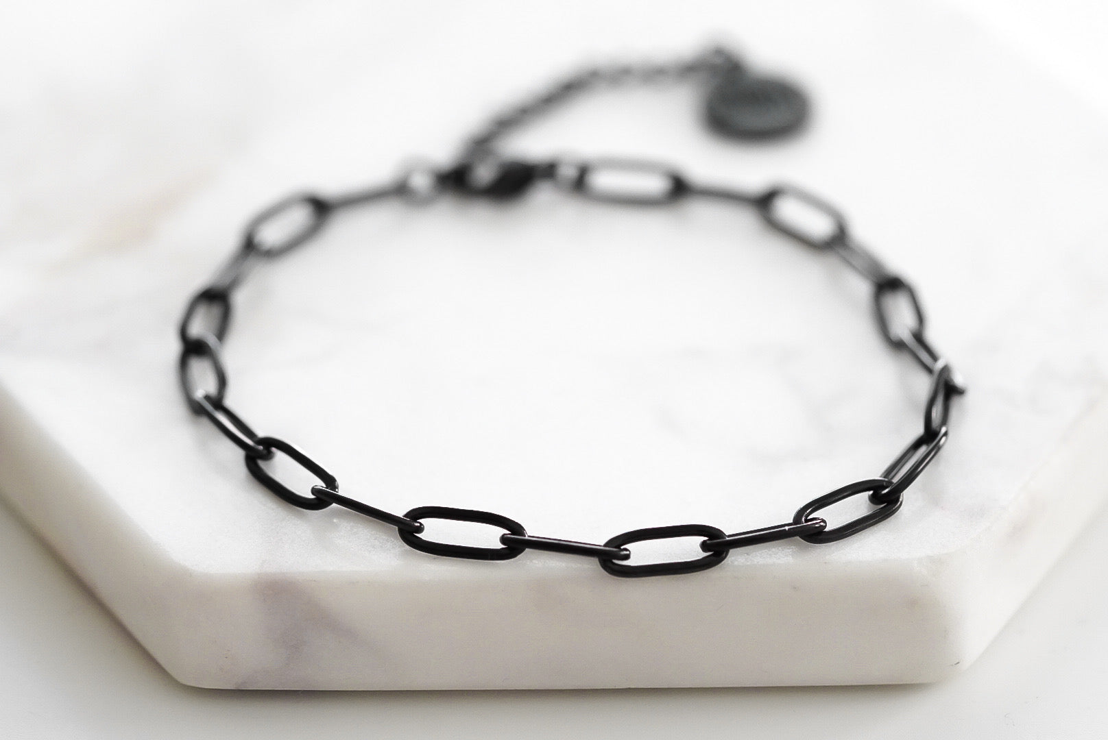 Black Chain Paperclip Hypoallergenic Nickel Free All Metal Adjustable Bracelet. Custom Lobster Clasp Accents And Designed With Love In Texas. Size 6 - 8.5 Inch Circumference With Custom Sizing Available On Select Pieces.