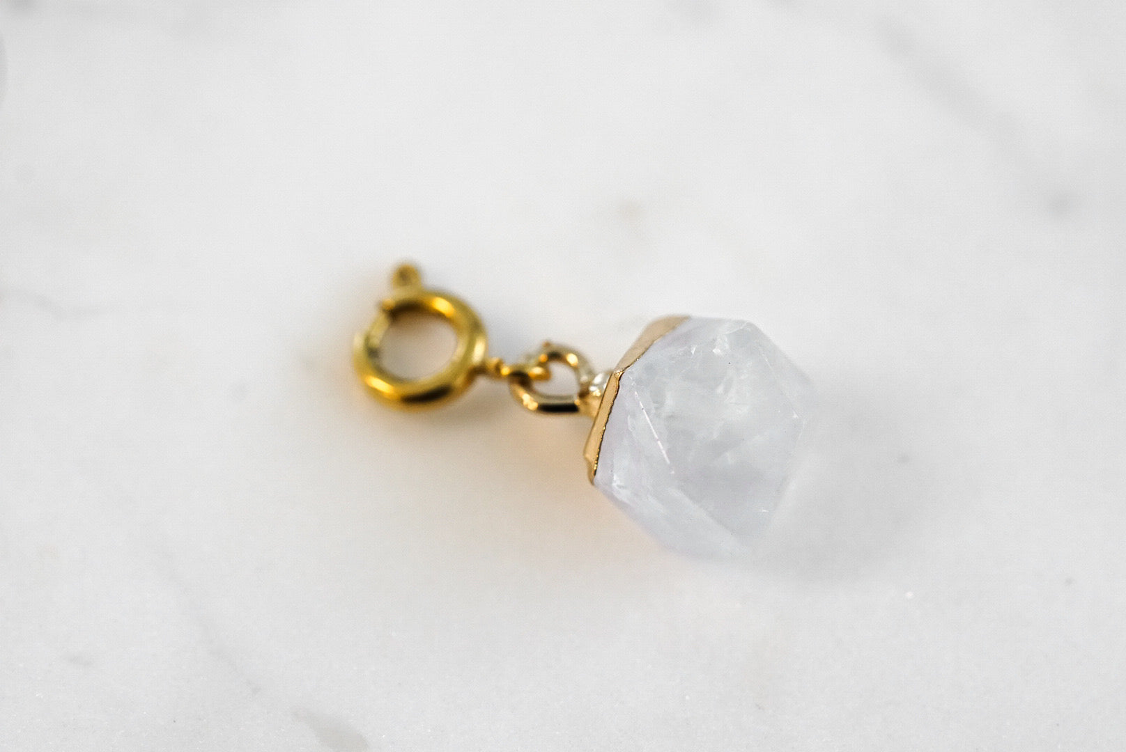 Gold And Pink Geometric Icosahedron Natural Stone Crystal Gemstone Hypoallergenic Nickel Free Charm Accessory. Custom Raw Natural Stone Accents And Designed With Love In Texas. Size 0.75 Inch Length x 0.25 Inch Width With Custom Sizing Available On Select Pieces.