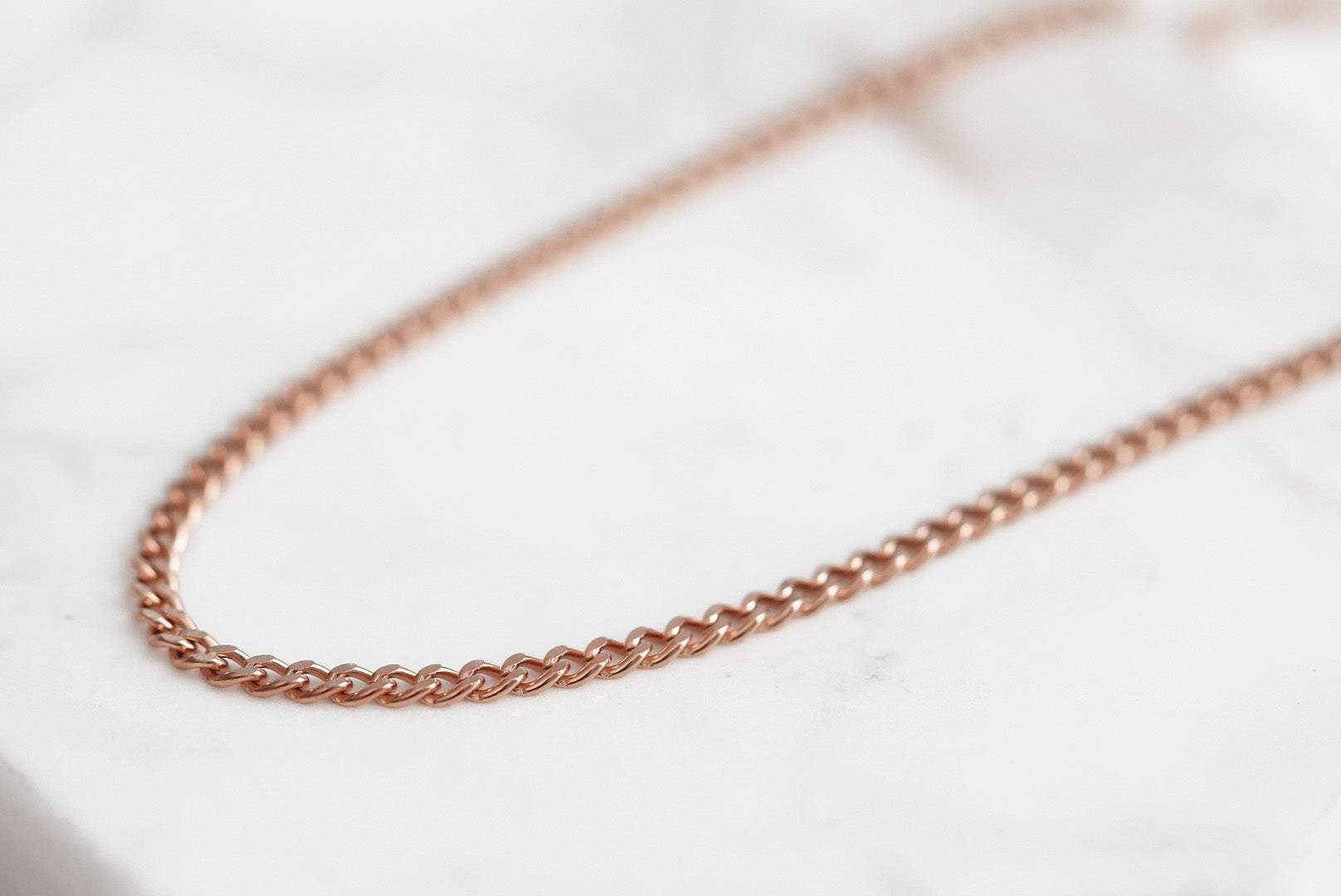 Rose Gold Curb Mens Hypoallergenic Nickel Free All Metal Chain Necklace. Custom Lobster Clasp Accents And Designed With Love In Texas. Size 18, 26 or 32 Inch Length, Plus 3 Inch Attached Necklace Extender With Custom Sizing Available On Select Pieces.