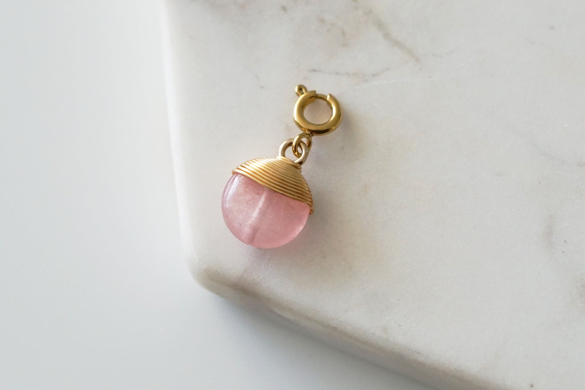 Gold And Pink Natural Stone Crystal Gemstone Wire Wrapped Hypoallergenic Nickel Free Charm Accessory. Custom Raw Natural Stone Accents And Designed With Love In Texas. Size 0.75 Inch Length x 0.25 Inch Width With Custom Sizing Available On Select Pieces.
