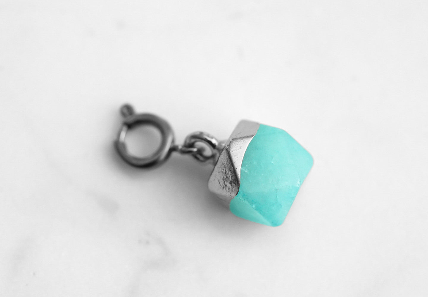 Silver And Light Blue Geometric Icosahedron Natural Stone Crystal Gemstone Hypoallergenic Nickel Free Charm Accessory. Custom Raw Natural Stone Accents And Designed With Love In Texas. Size 0.75 Inch Length x 0.25 Inch Width With Custom Sizing Available On Select Pieces.