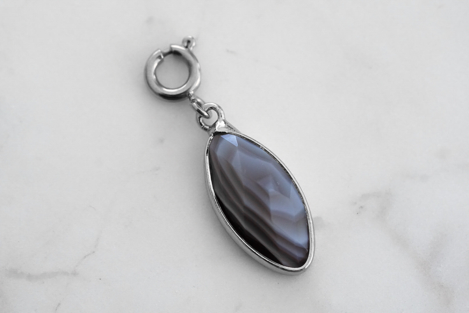 Silver And Gray Diamond Geometric Natural Stone Crystal Gemstone Hypoallergenic Nickel Free Charm Accessory. Custom Raw Natural Stone Accents And Designed With Love In Texas. Size 1 Inch Length x 0.25 Inch Width With Custom Sizing Available On Select Pieces.