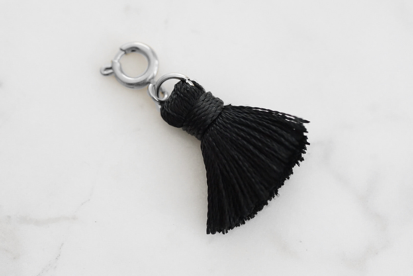 Silver And Black Fringe Hypoallergenic Nickel Free Charm Accessory. Custom Tassels Accents And Designed With Love In Texas. Size 1 Inch Length x 0.25 Inch Width With Custom Sizing Available On Select Pieces.