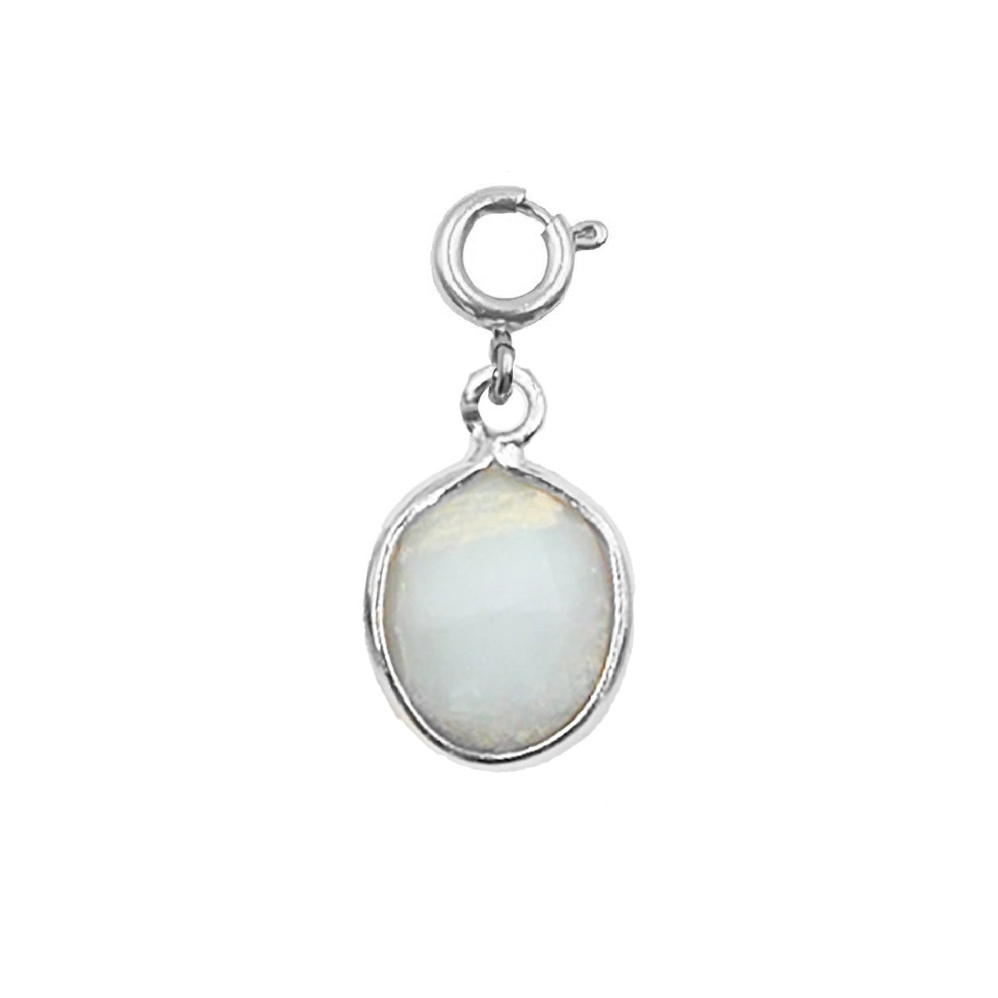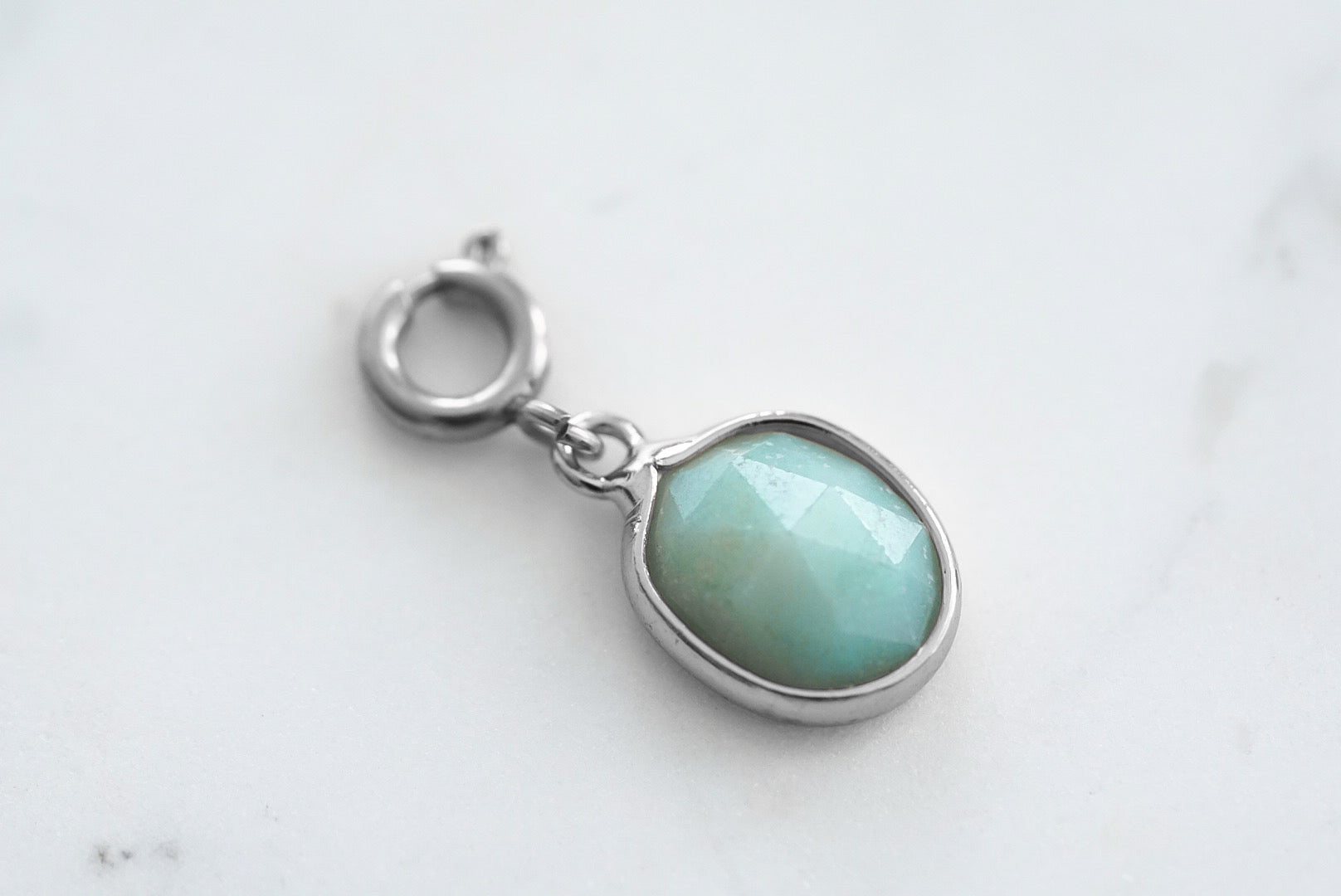 Silver And Light Blue Disc Natural Stone Crystal Gemstone Oval Hypoallergenic Nickel Free Charm Accessory. Custom Raw Natural Stone Accents And Designed With Love In Texas. Size 0.75 Inch Length x 0.37 Inch Width With Custom Sizing Available On Select Pieces.