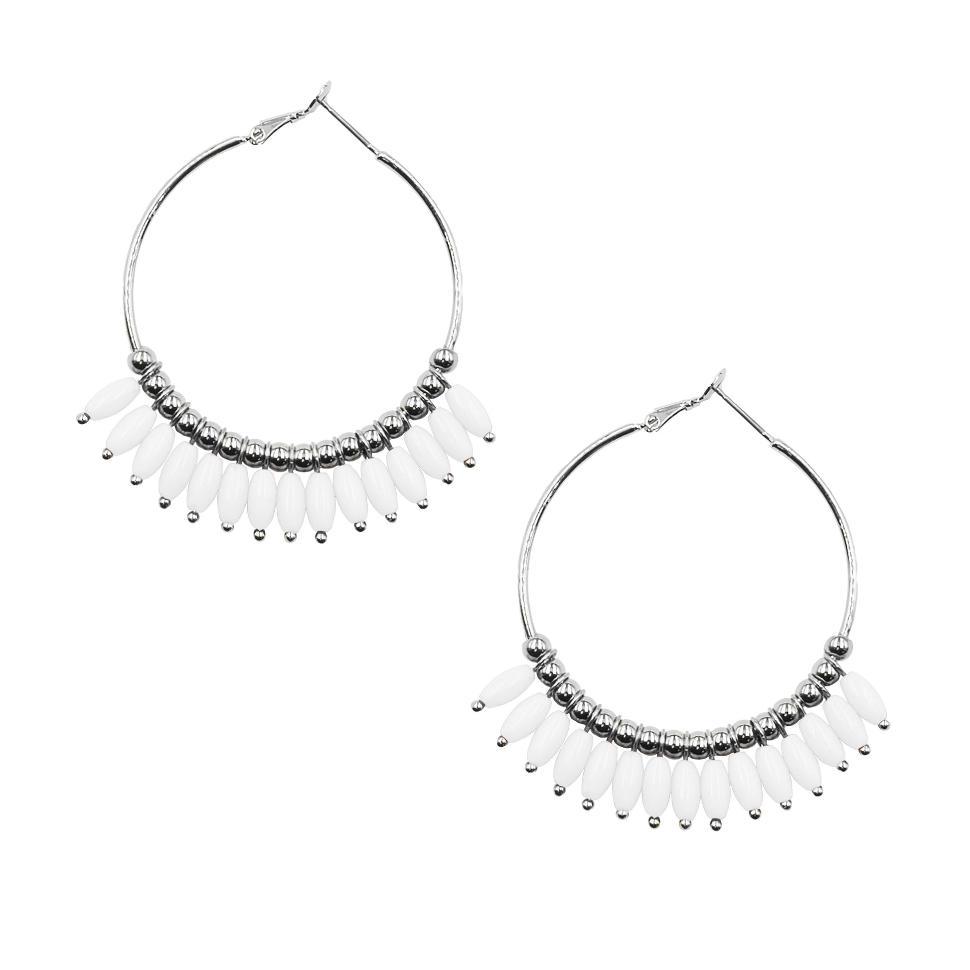 Silver And White Beads Dangle Fringe Lightweight Hypoallergenic Nickel Free Statement Hoop Earrings. Custom Decorative Accent Beads Accents And Designed With Love In Texas. Size 1.5 Inches Width x 2.25 Inches Length With Custom Sizing Available On Select Pieces.
