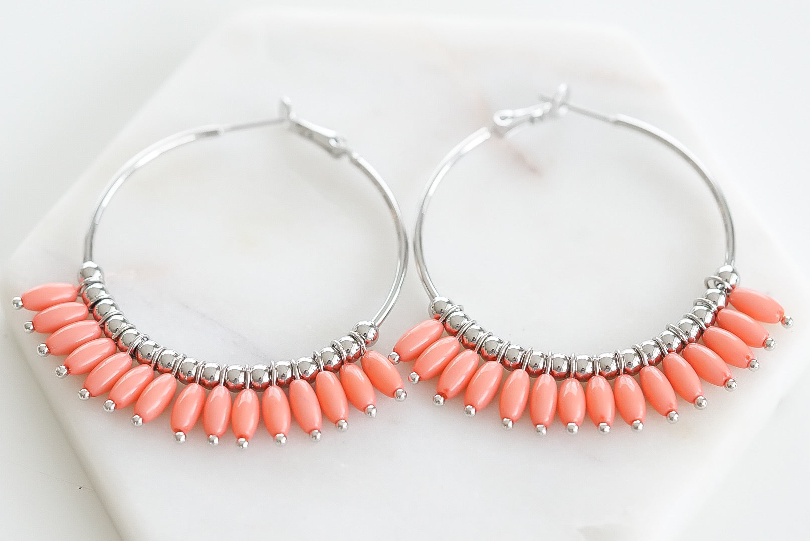 Silver And Pink Beads Dangle Fringe Lightweight Hypoallergenic Nickel Free Statement Hoop Earrings. Custom Decorative Accent Beads Accents And Designed With Love In Texas. Size 1.5 Inches Width x 2.25 Inches Length With Custom Sizing Available On Select Pieces.