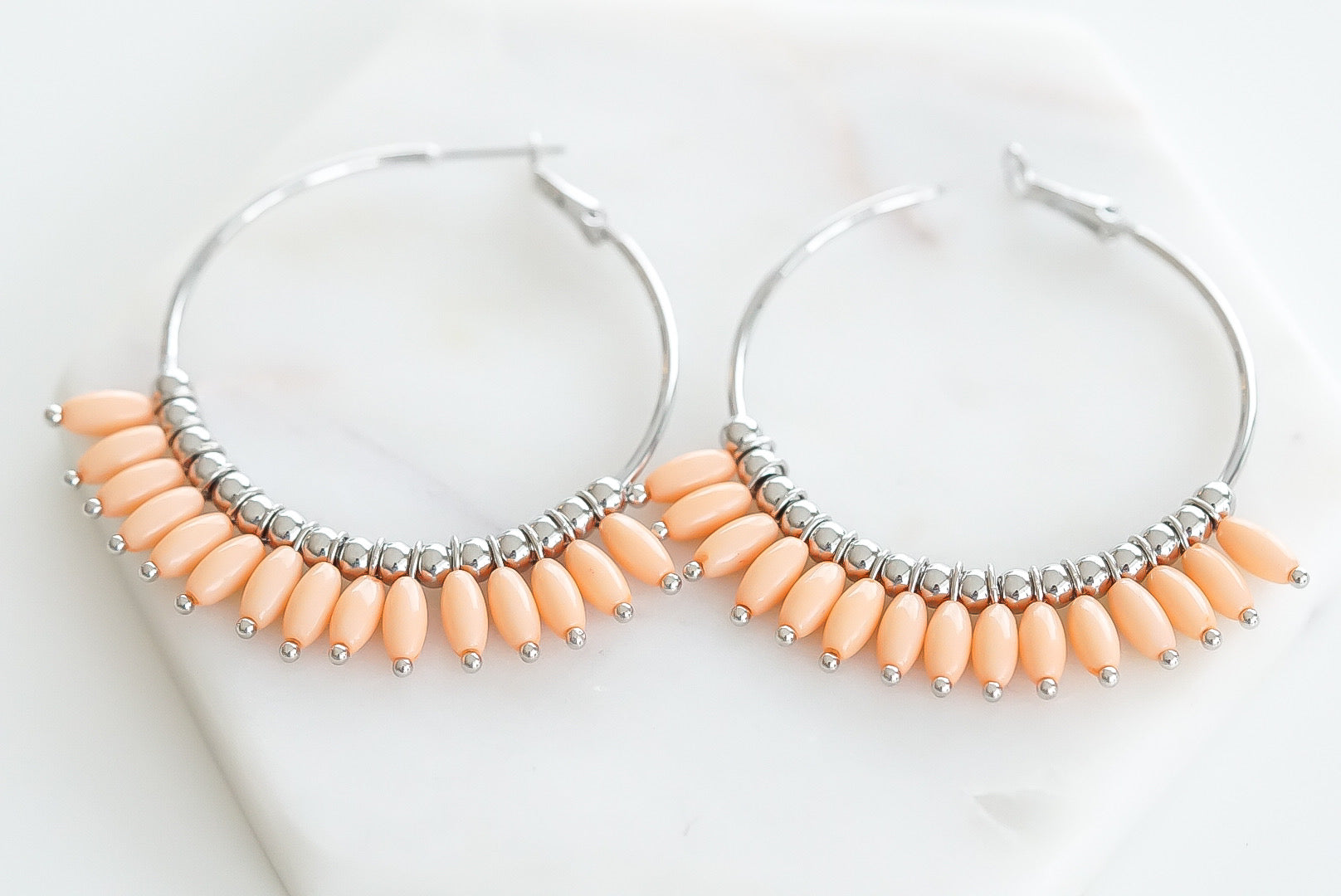Silver And Orange Beads Dangle Fringe Lightweight Hypoallergenic Nickel Free Statement Hoop Earrings. Custom Decorative Accent Beads Accents And Designed With Love In Texas. Size 1.5 Inches Width x 2.25 Inches Length With Custom Sizing Available On Select Pieces.