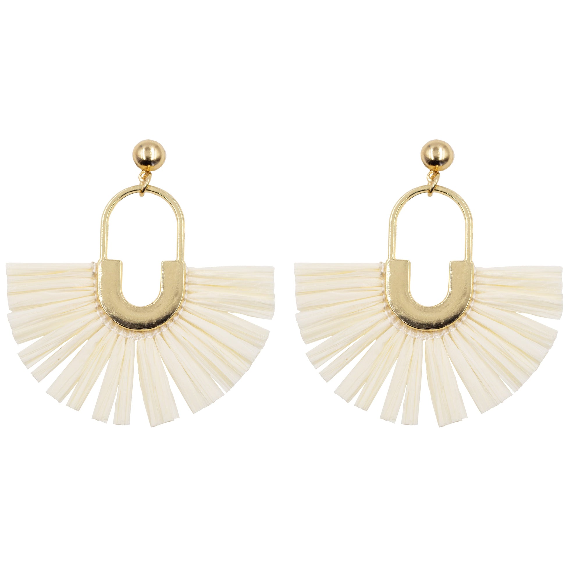 Gold And White Boho Bold Cream Rafia Straw Studded Tropical Lightweight Statement Drop Earrings. Custom Geometric Shapes Accents And Designed With Love In Texas. Size 2 Inches Width x 2 Inches Length With Custom Sizing Available On Select Pieces.