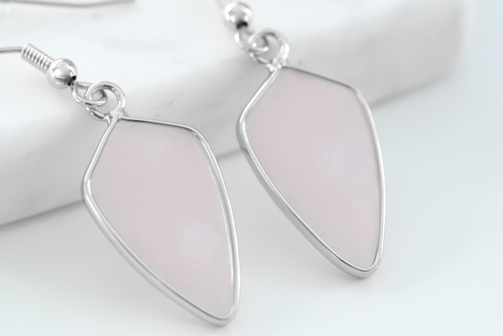 Silver And Pink Arrowhead Dangle Natural Stone Crystal Gemstone Triangular Lightweight Hypoallergenic Nickel Free Statement Drop Earrings. Custom Druzy Raw Natural Quartz Stone Accents And Designed With Love In Texas. Size 2.5 Inches Length x 0.75 Inches Width With Custom Sizing Available On Select Pieces.
