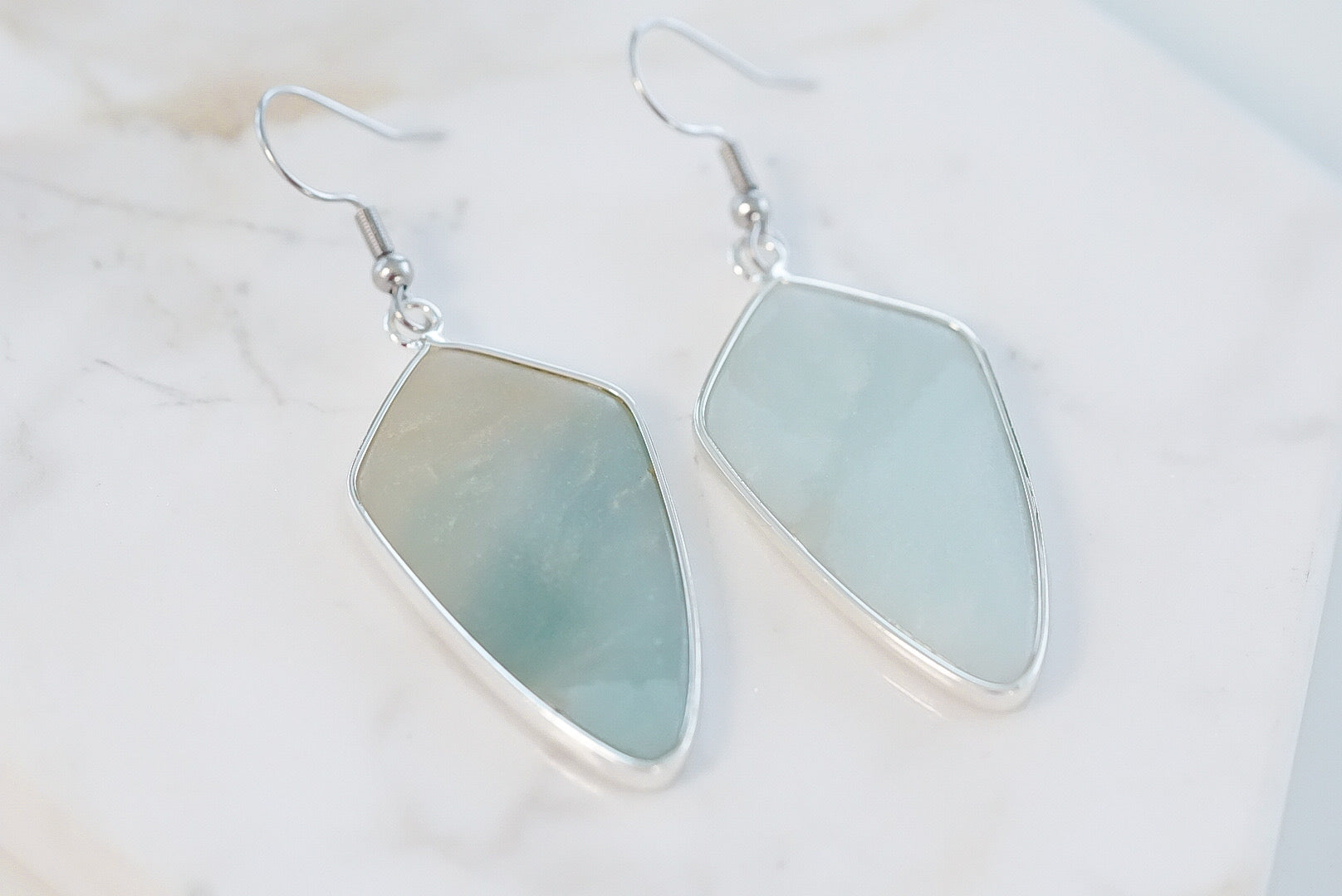 Silver And Light Blue Arrowhead Dangle Natural Stone Crystal Gemstone Triangular Lightweight Hypoallergenic Nickel Free Statement Drop Earrings. Custom Amazonite Raw Natural Stone Accents And Designed With Love In Texas. Size 2.5 Inches Length x 0.75 Inches Width With Custom Sizing Available On Select Pieces.