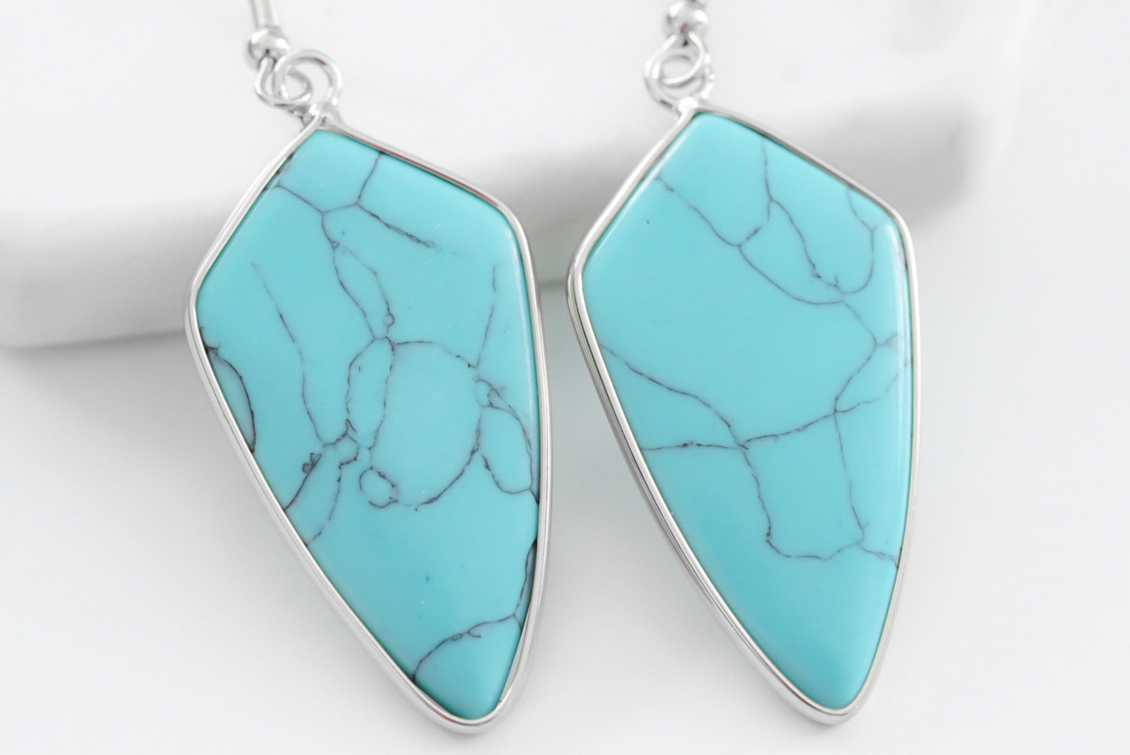 Silver And Light Blue Arrowhead Dangle Marble Natural Stone Crystal Gemstone Triangular Turquoise Lightweight Hypoallergenic Nickel Free Drop Earrings. Custom Blue Howlite Raw Natural Stone Accents And Designed With Love In Texas. Size 2.5 Inches Length x 0.75 Inches Width With Custom Sizing Available On Select Pieces.