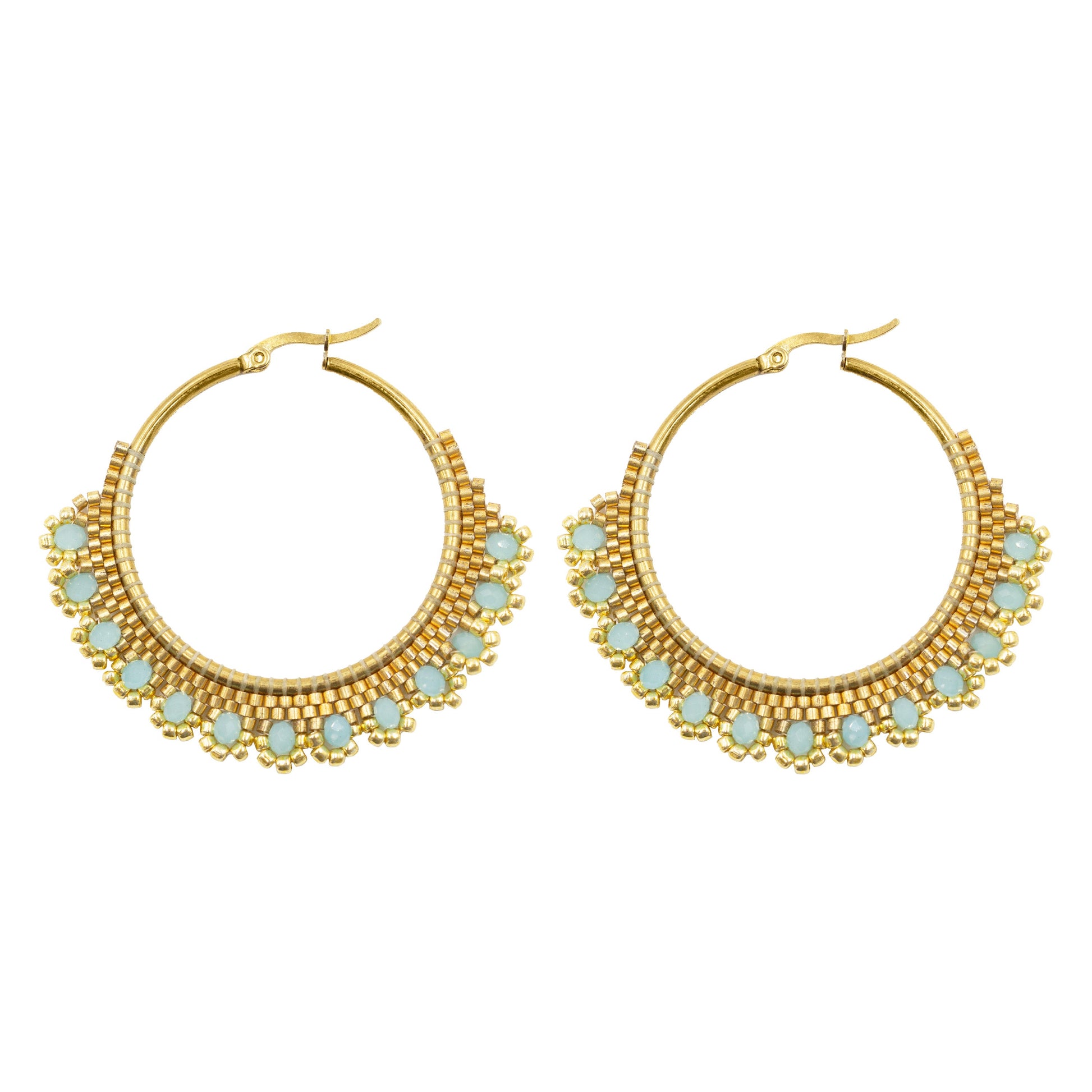 Gold And Blue Egyptian Faceted Ornate Lightweight Hypoallergenic Nickel Free Hoop Earrings. Custom Chalcedony Raw Natural Stone Accents And Designed With Love In Texas. Size 2.0 Inches Diameter With Custom Sizing Available On Select Pieces.