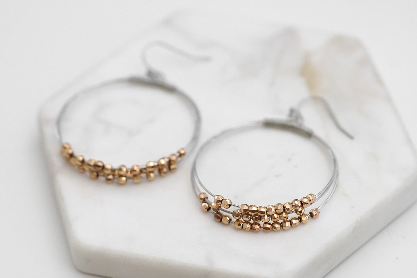 Silver Cubed Faceted Multistrand Lightweight Hypoallergenic Nickel Free All Metal Drop Earrings. Custom 18K Yellow Gold Ion Plated Stainless Steel Decorative Accent Beads Accents And Designed With Love In Texas. Size 1.75 Inches Diameter With Custom Sizing Available On Select Pieces.