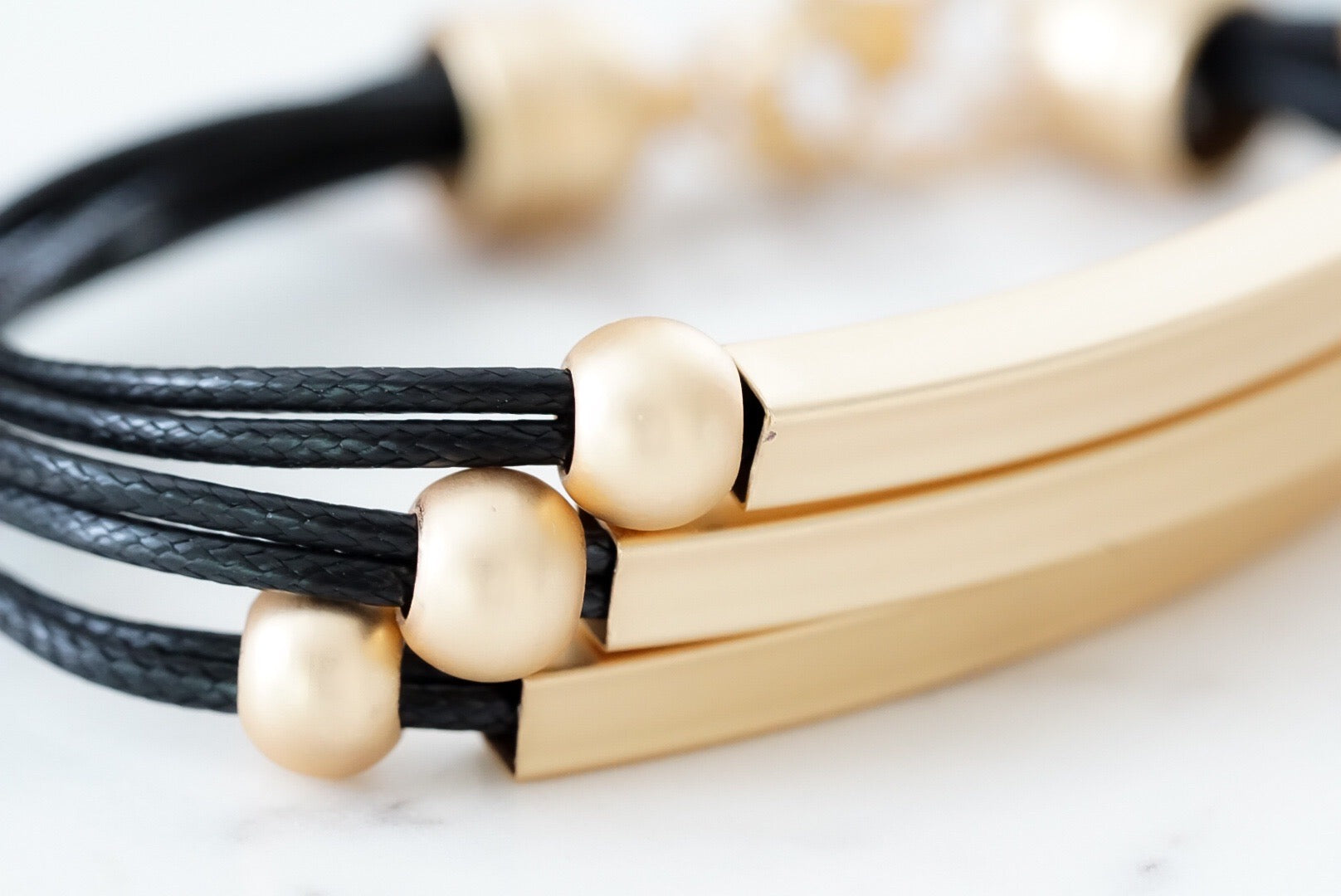 Gold And Black Bar Multistrand Hypoallergenic Nickel Free Adjustable Bracelet. Custom Decorative Accent Beads Accents And Designed With Love In Texas. Size 6.5 - 8 Inch Circumference With Custom Sizing Available On Select Pieces.