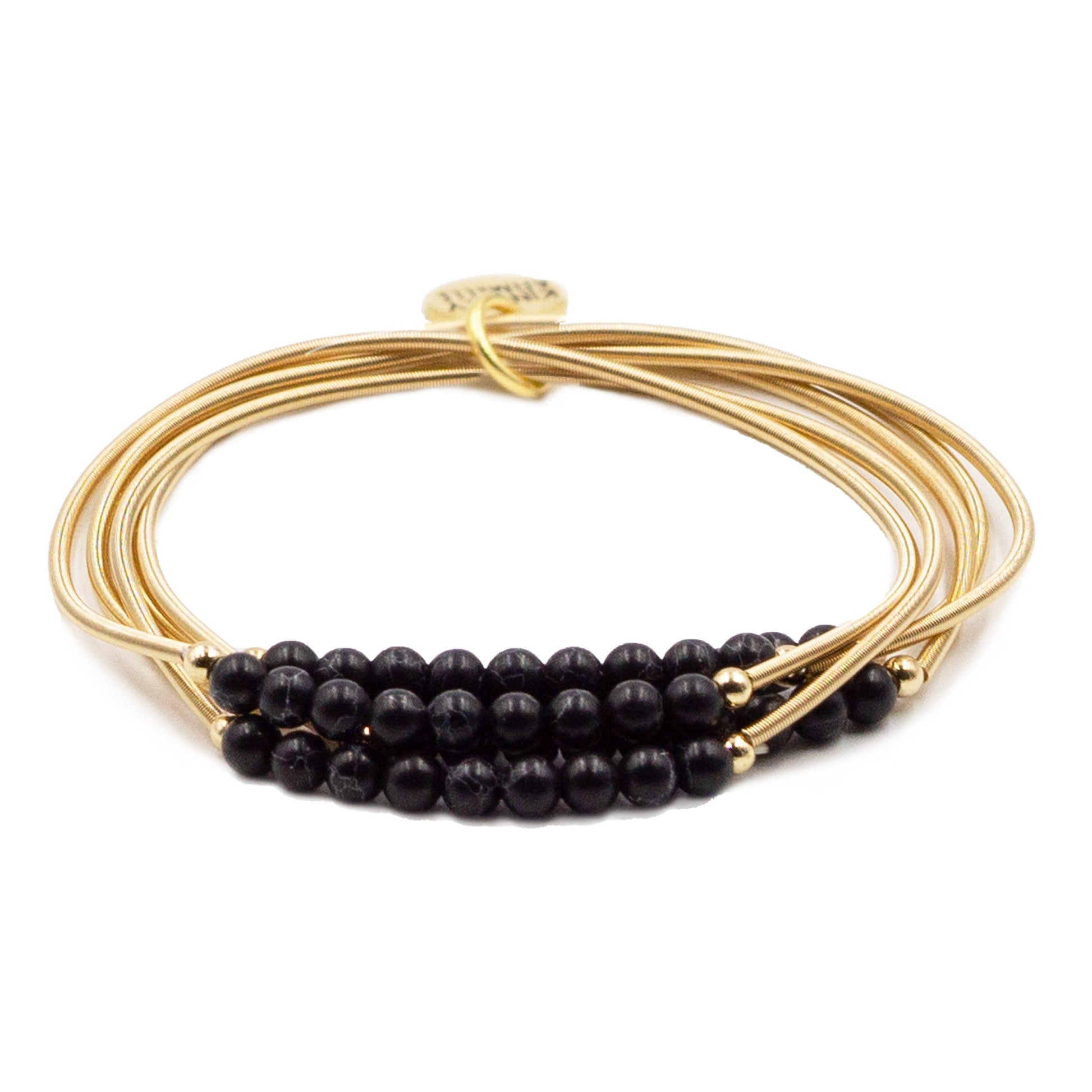 Gold And Black Multistrand Natural Stone Hypoallergenic Nickel Free Wrap Bracelet. Custom Marquina Marble Accents And Designed With Love In Texas. Size Variations With Custom Sizing Available On Select Pieces.