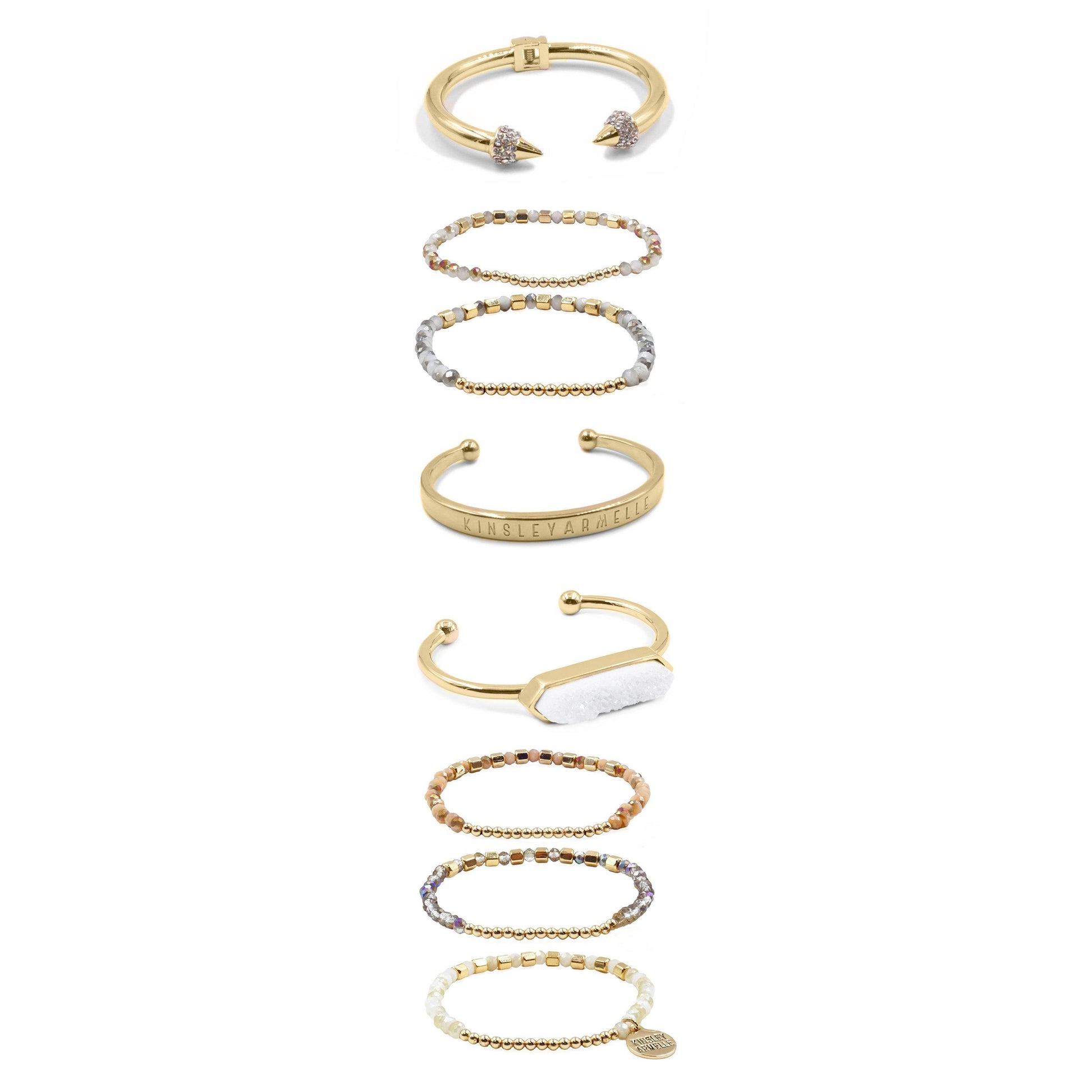 Gold And Pink Beads Cuff Druzy Engraved Hinged Natural Stone Crystal Gemstone Pave Raw Spike Stackable Hypoallergenic Nickel Free Bracelet Stack Set. Custom Druzy Raw Natural Quartz Stone Accents And Designed With Love In Texas. Size Small, Medium, Large, and Extra Large Ranging From 6.25 - 7.25 Inch Circumference With Custom Sizing Available On Select Pieces.