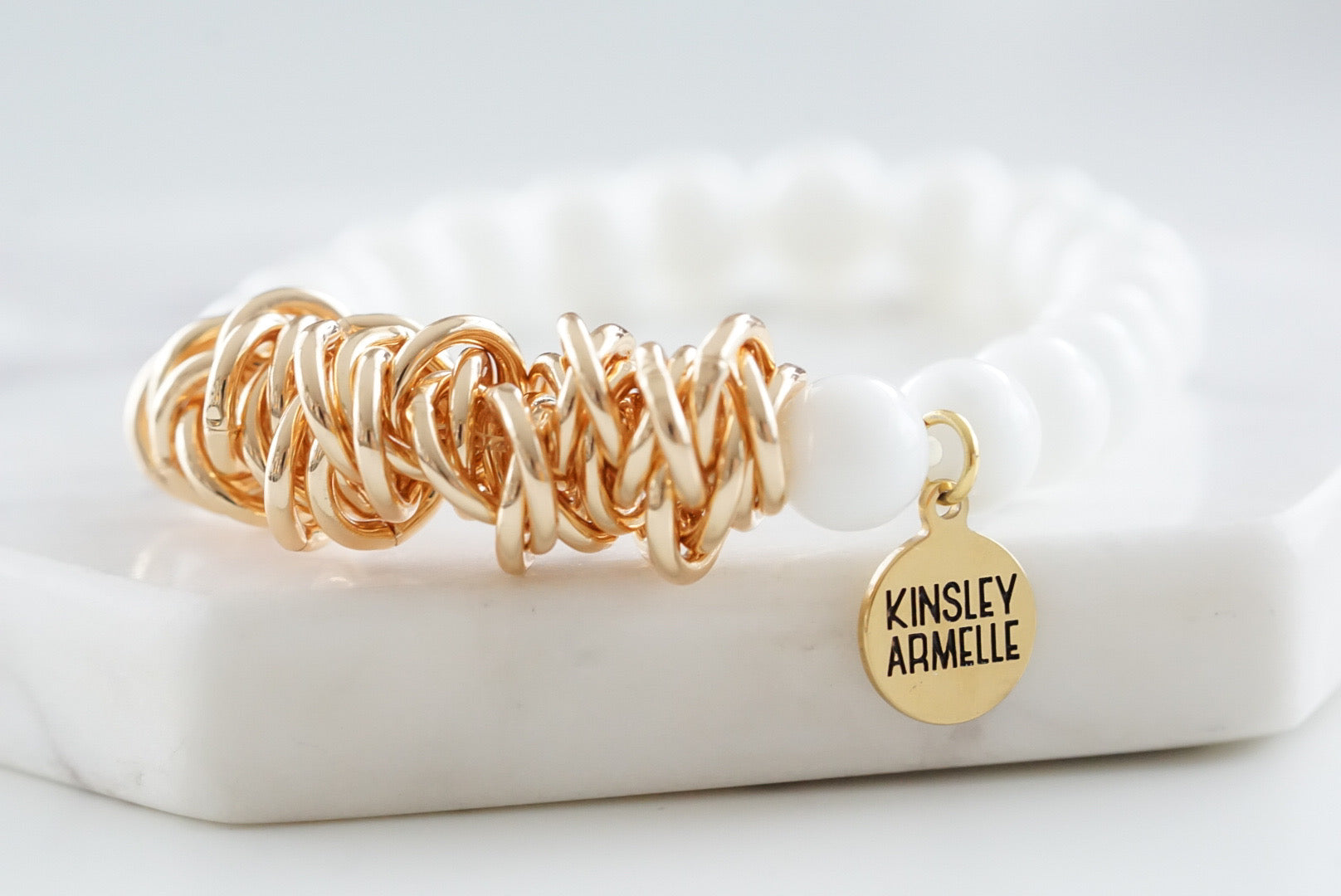 Gold And White Chain Clustered Hypoallergenic Nickel Free Beaded Stretch Bracelet. Custom Decorative Accent Beads Accents And Designed With Love In Texas. Size Small, Medium, Large, and Extra Large Ranging From 6.25 - 7.25 Inch Circumference With Custom Sizing Available On Select Pieces.