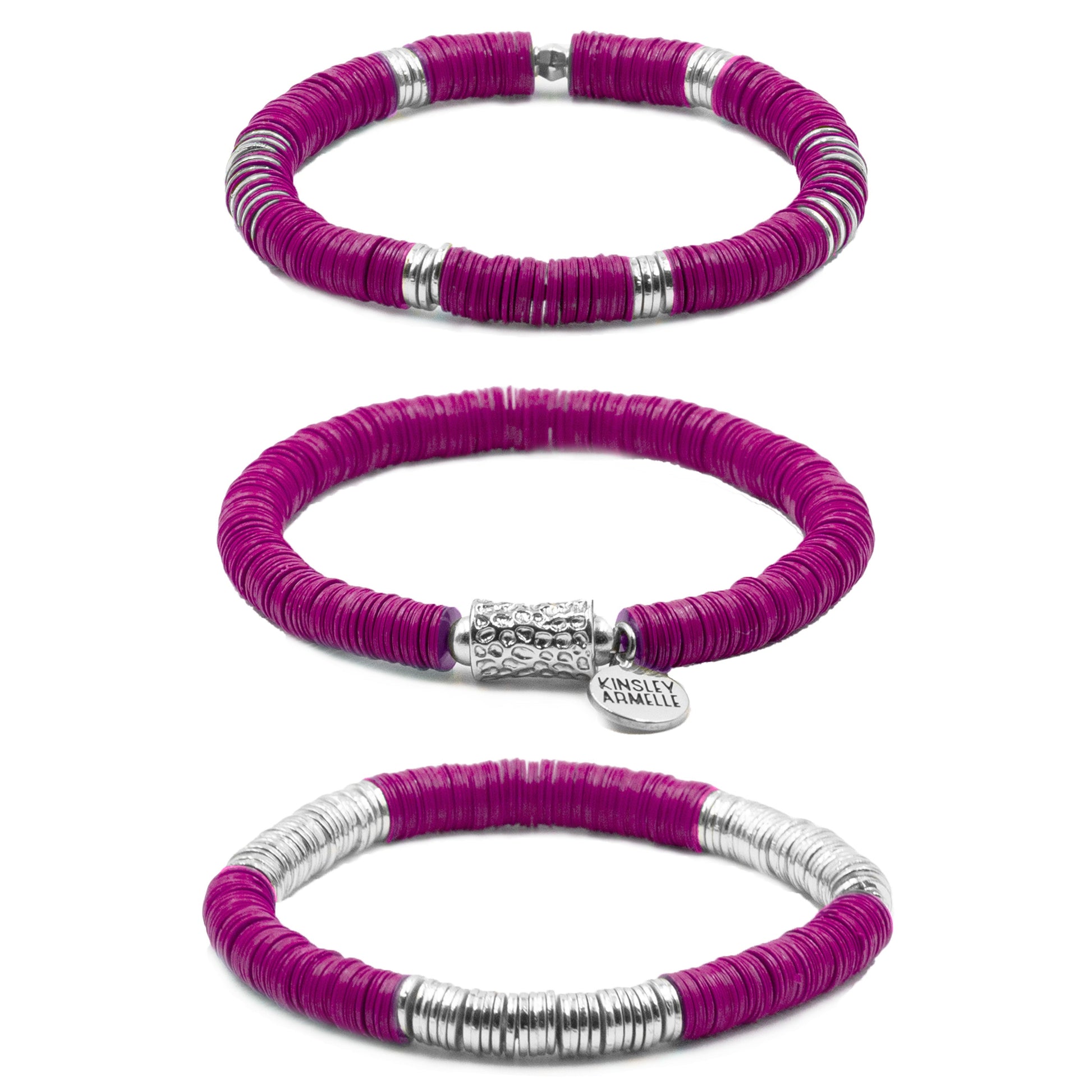 Silver And Purple Coil Coin Disc Tropical Hypoallergenic Nickel Free Bracelet Stack Set. Custom Silver Plated Brass Hammered Bar Accents And Designed With Love In Texas. Size 6.25 - 7.25 Inches Circumference With Custom Sizing Available On Select Pieces.