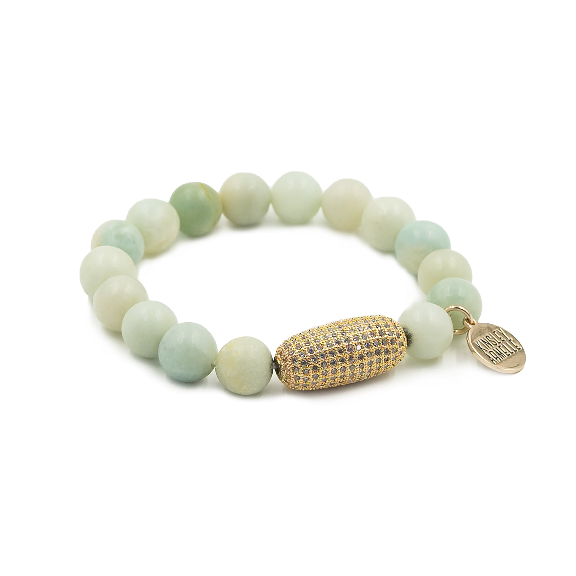 Gold And Light Blue Glossy Natural Stone Pave Hypoallergenic Nickel Free Beaded Stretch Bracelet. Custom Zircon Gemstones Pave Rhinestone Bar Accents And Designed With Love In Texas. Size Small, Medium, Large, and Extra Large Ranging From 6.25 - 7.25 Inch Circumference With Custom Sizing Available On Select Pieces.