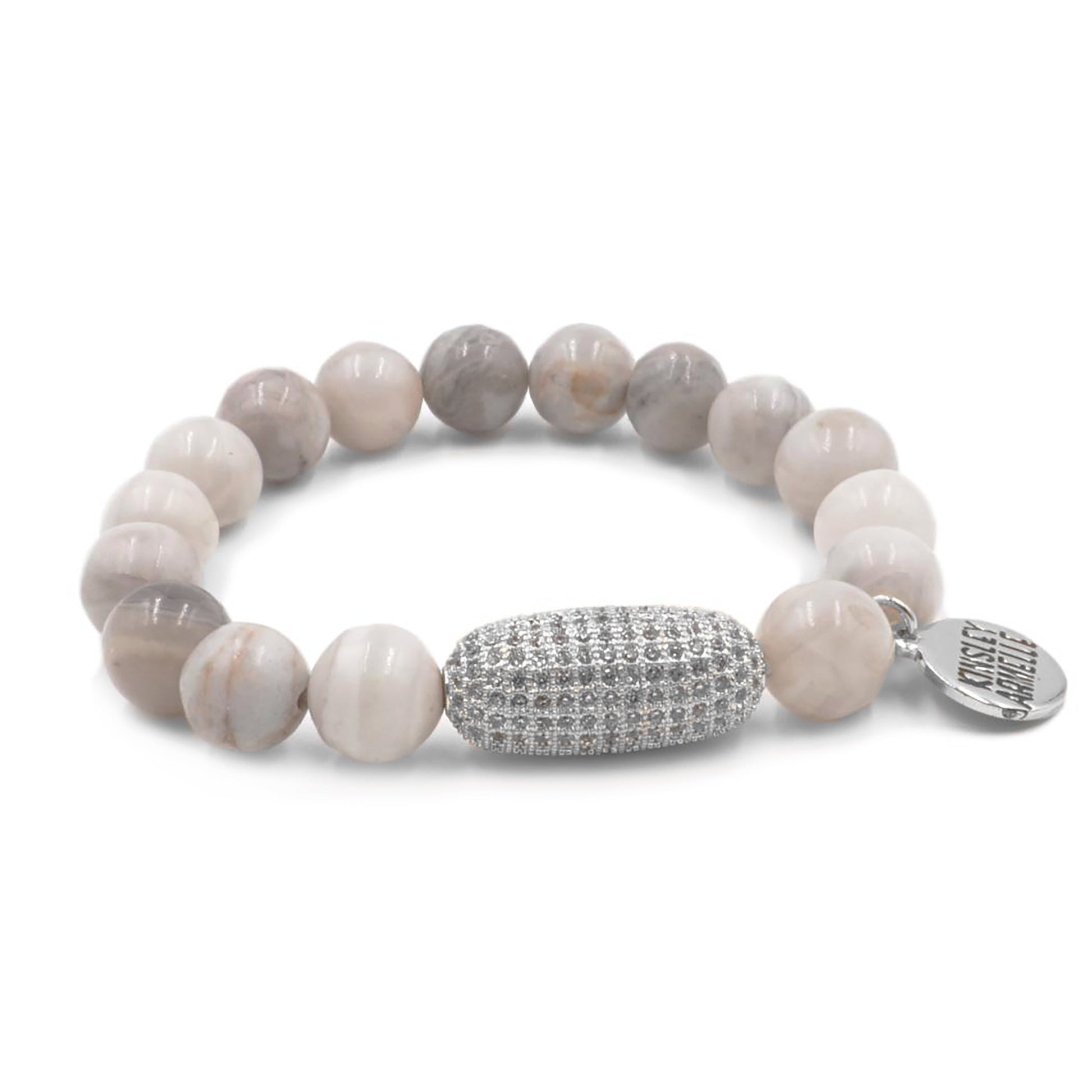 Silver And Gray Glossy Natural Stone Pave Hypoallergenic Nickel Free Beaded Stretch Bracelet. Custom Zircon Gemstones Pave Rhinestone Bar Accents And Designed With Love In Texas. Size Small, Medium, Large, and Extra Large Ranging From 6.25 - 7.25 Inch Circumference With Custom Sizing Available On Select Pieces.