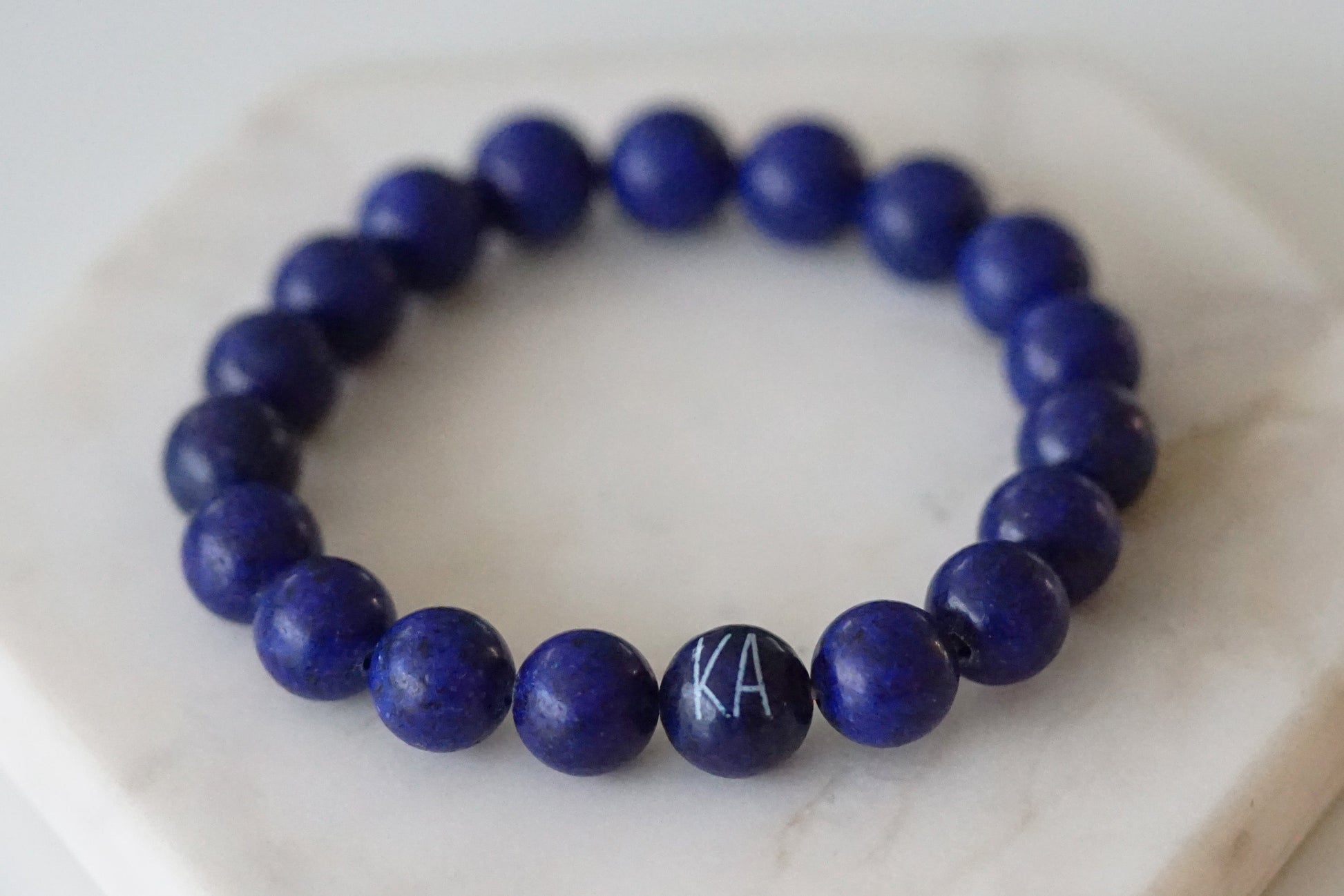 White And Blue Mens Natural Stone Hypoallergenic Nickel Free Beaded Stretch Bracelet. Custom Kinsley Armelle Engraved Logo Accents And Designed With Love In Texas. Size Small, Medium, Large, and Extra Large Ranging From 6.25 - 7.25 Inch Circumference With Custom Sizing Available On Select Pieces.