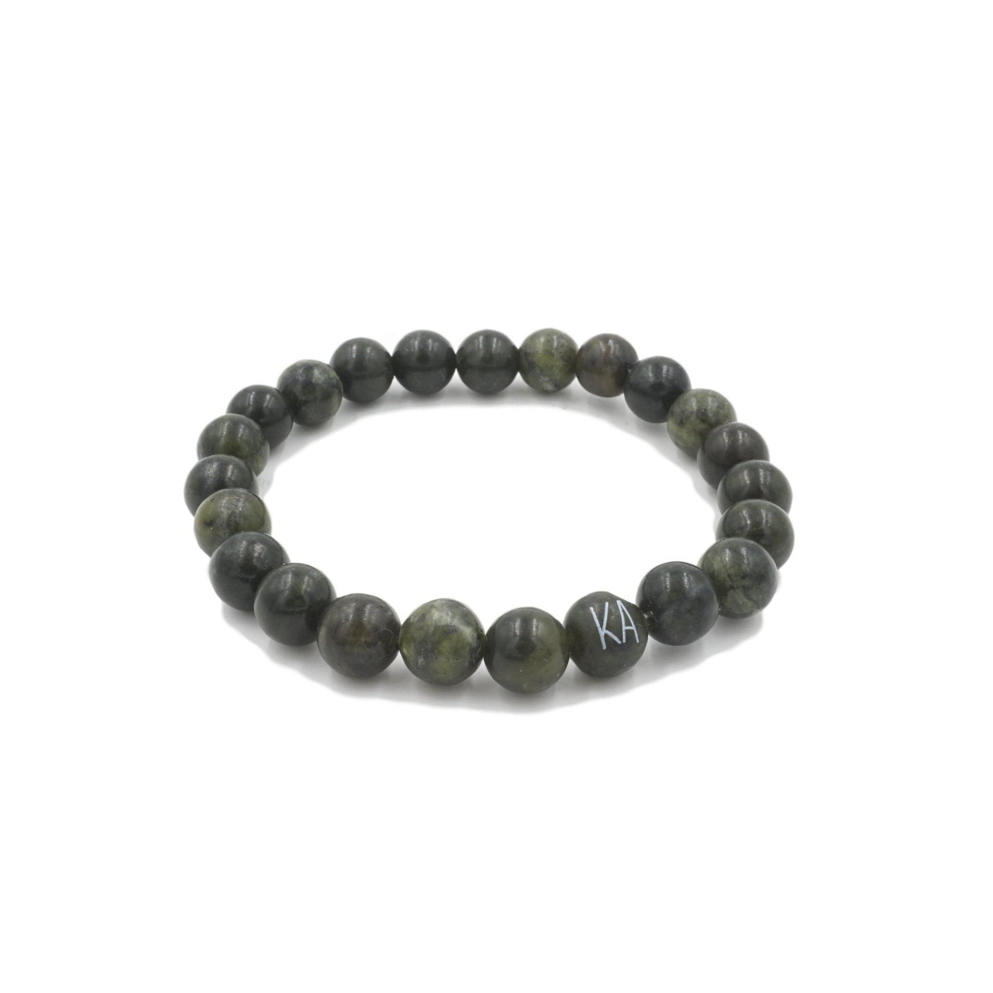 White And Green Mens Natural Stone Hypoallergenic Nickel Free Beaded Stretch Bracelet. Custom Kinsley Armelle Engraved Logo Accents And Designed With Love In Texas. Size Small, Medium, Large, and Extra Large Ranging From 6.25 - 7.25 Inch Circumference With Custom Sizing Available On Select Pieces.