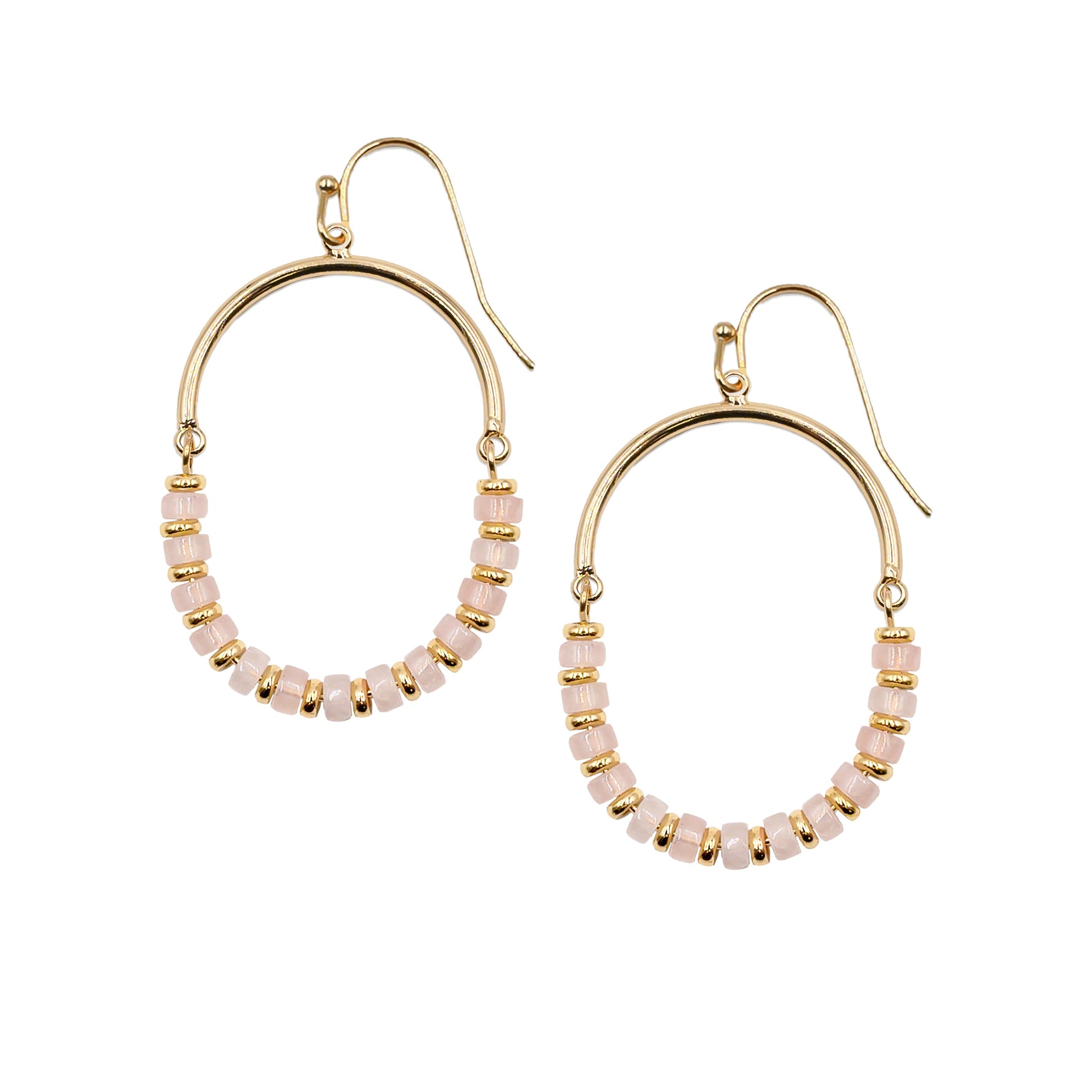 Gold And Pink Natural Stone Featherweight Hypoallergenic Nickel Free Hoop Earrings. Custom Druzy Raw Natural Quartz Stone Accents And Designed With Love In Texas. Size 1.75 Inches Length x 1.25 Inches Width With Custom Sizing Available On Select Pieces.