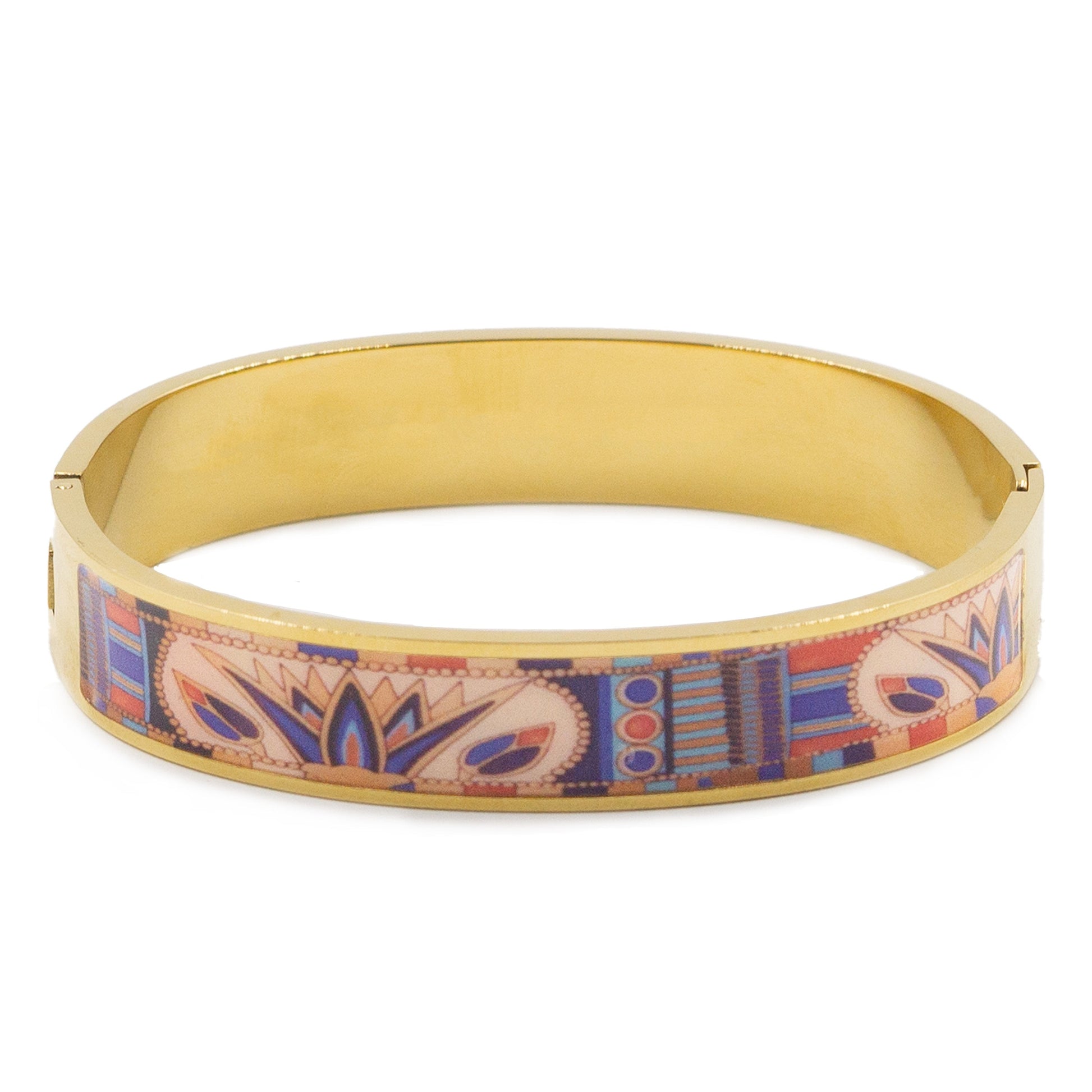 Gold Bangle Egyptian Hinged Multicolored Hypoallergenic Nickel Free All Metal Bangle Cuff Bracelet. Custom Geometric Shapes Accents And Designed With Love In Texas. Size 6.25 Inches Circumference With Custom Sizing Available On Select Pieces.