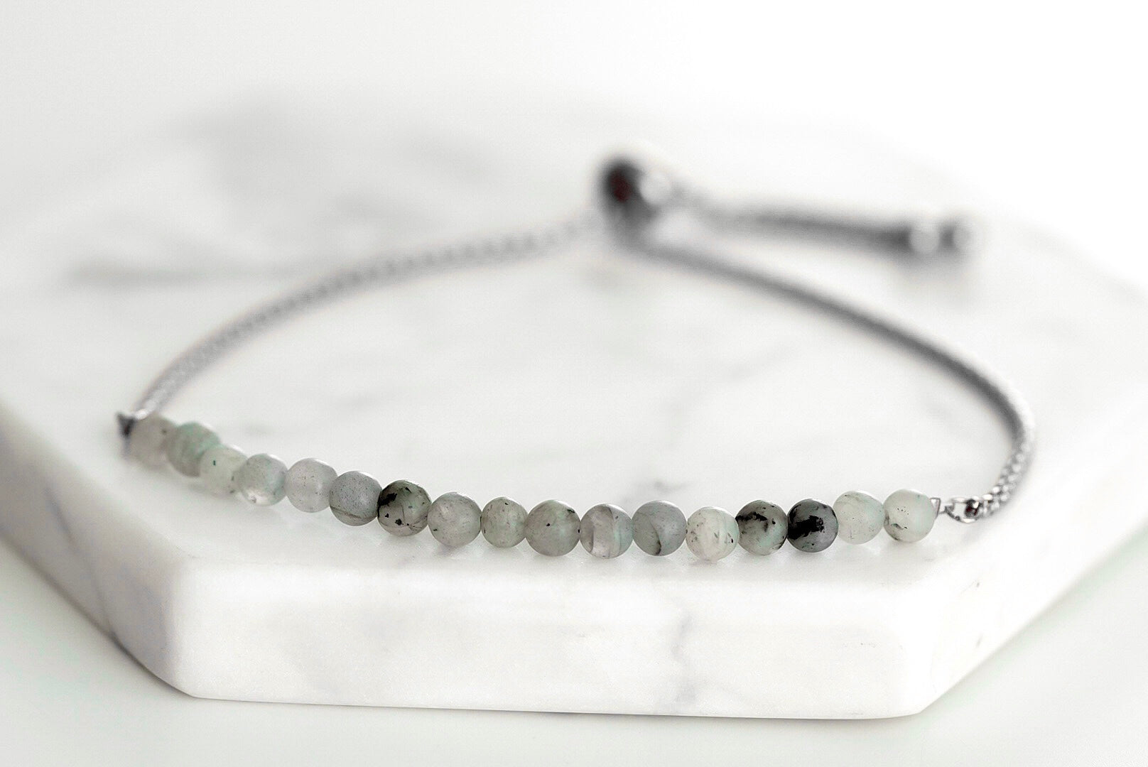 Silver And Green Bolo Sliding Clasp Bolo Sliding Knot Hypoallergenic Nickel Free Dainty Adjustable Bracelet. Custom Labradorite Raw Natural Stone Accents And Designed With Love In Texas. Size 1 Inch to 9 Inch Circumference With Custom Sizing Available On Select Pieces.