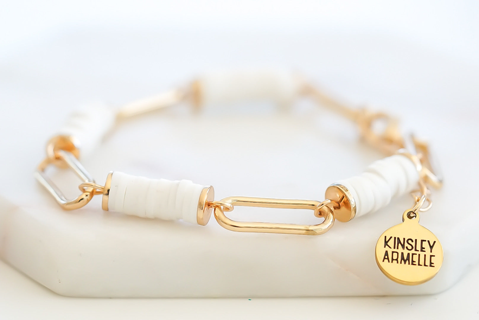 Gold And White Clasp Heishi Station Hypoallergenic Nickel Free Adjustable Bracelet. Custom Clay Decorative Accent Beads Accents And Designed With Love In Texas. Size 6.5 - 8 Inch Circumference With Custom Sizing Available On Select Pieces.