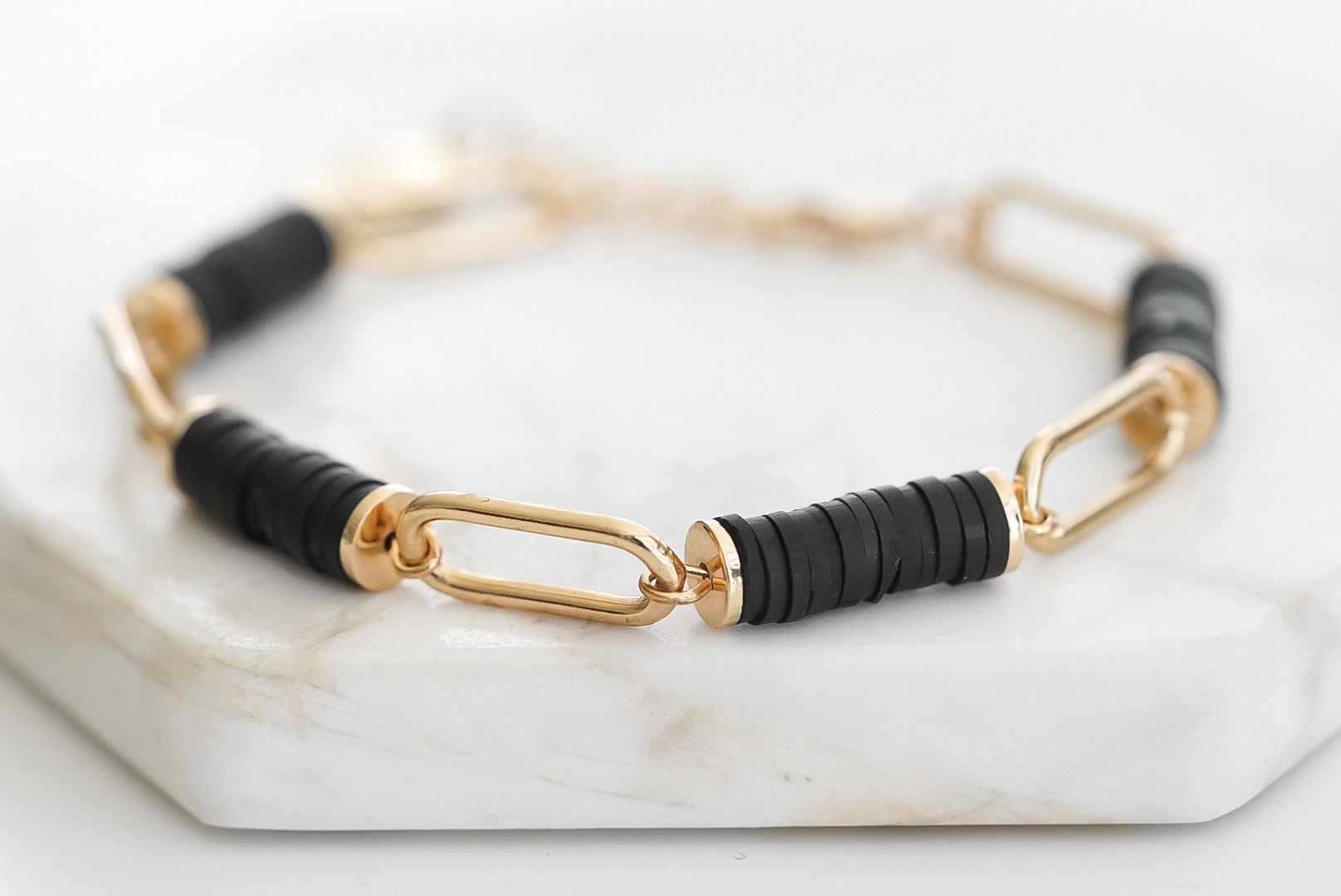 Gold And Black Clasp Heishi Station Hypoallergenic Nickel Free Adjustable Bracelet. Custom Clay Decorative Accent Beads Accents And Designed With Love In Texas. Size 6.5 - 8 Inch Circumference With Custom Sizing Available On Select Pieces.