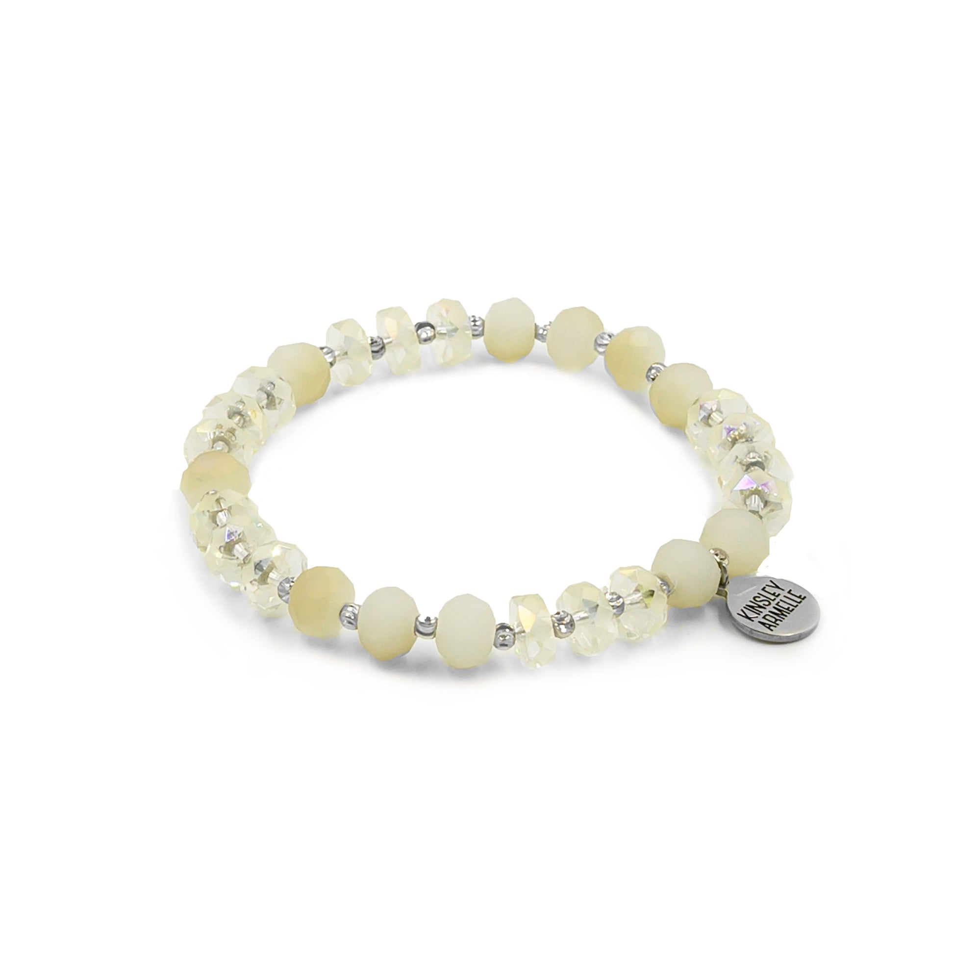 Silver And Yellow Asymmetrical Faceted Iridescent Hypoallergenic Nickel Free Beaded Stretch Bracelet. Custom Decorative Accent Beads Accents And Designed With Love In Texas. Size Small, Medium, Large, and Extra Large Ranging From 6.25 - 7.25 Inch Circumference With Custom Sizing Available On Select Pieces.