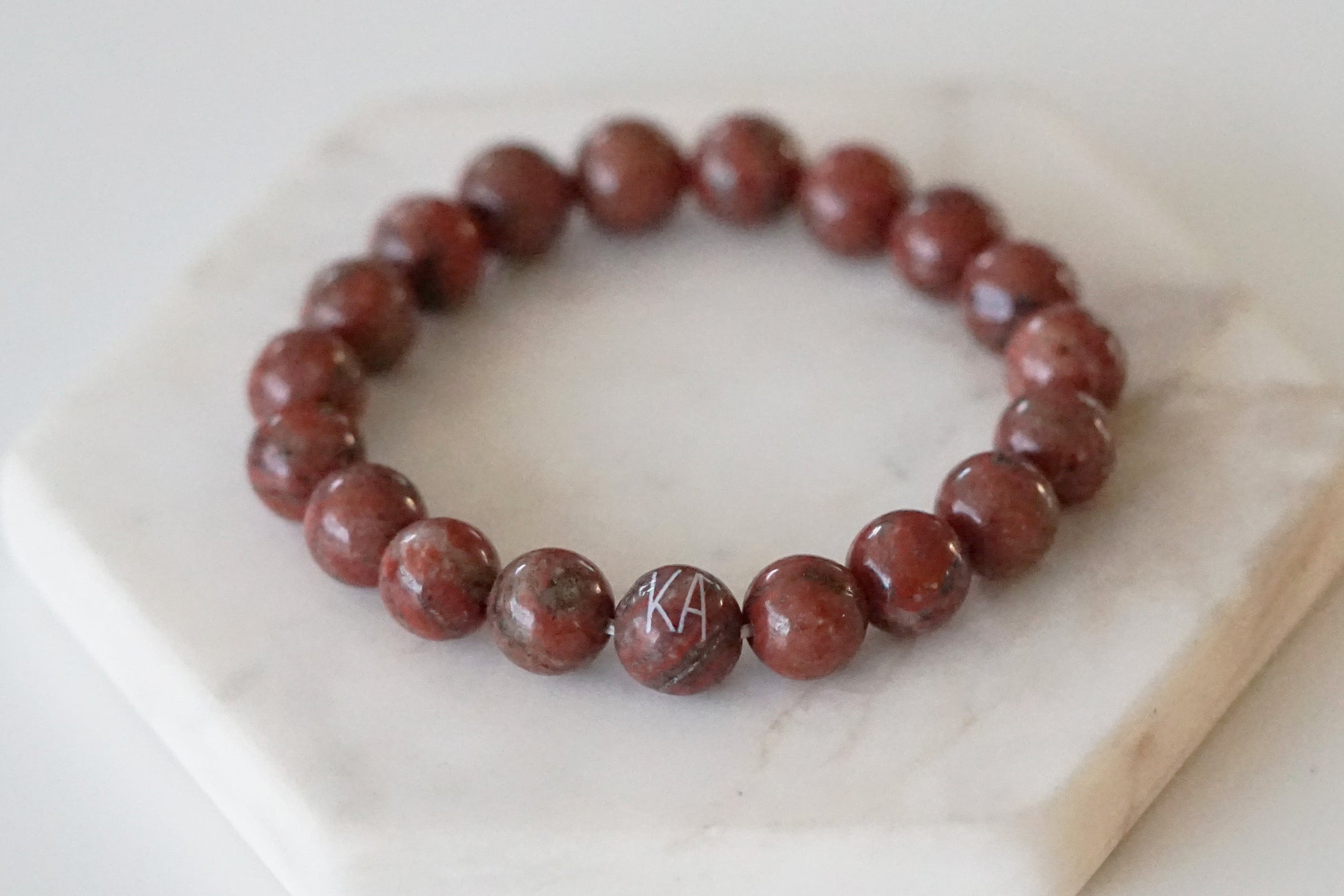 White And Red Glossy Natural Stone Hypoallergenic Nickel Free Beaded Stretch Bracelet. Custom Kinsley Armelle Engraved Logo Accents And Designed With Love In Texas. Size Small, Medium, Large, and Extra Large Ranging From 6.25 - 7.25 Inch Circumference With Custom Sizing Available On Select Pieces.