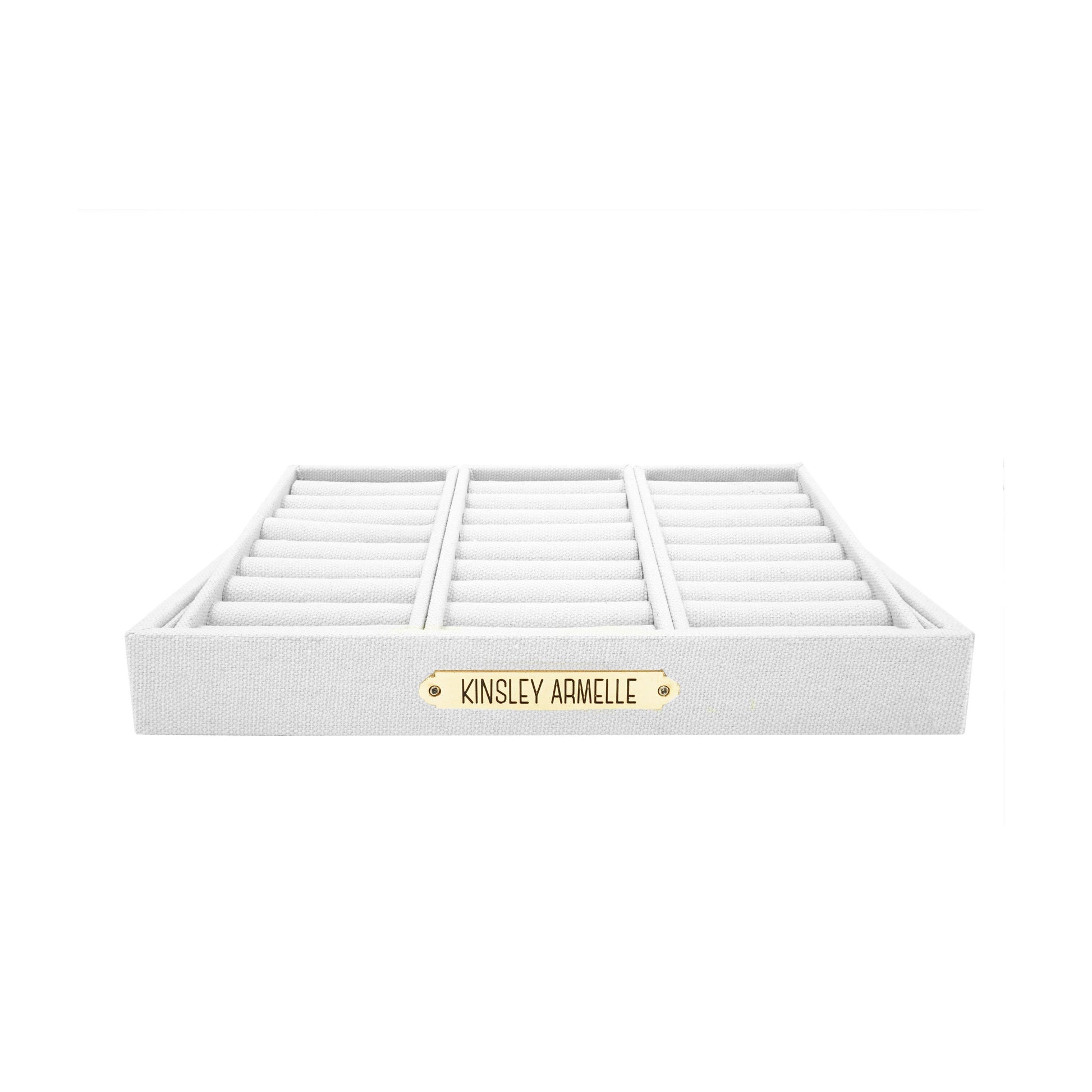 Gold And White Stand Hypoallergenic Nickel Free Jewelry Tray Jewelry Organizer. Custom 18K Yellow Gold Ion Plated Stainless Steel Kinsley Armelle Engraved Plate Accents And Designed With Love In Texas. Size 9.5 Inches Length x 6.5 Inches Wide x 1.5 Inches Tall With Custom Sizing Available On Select Pieces.