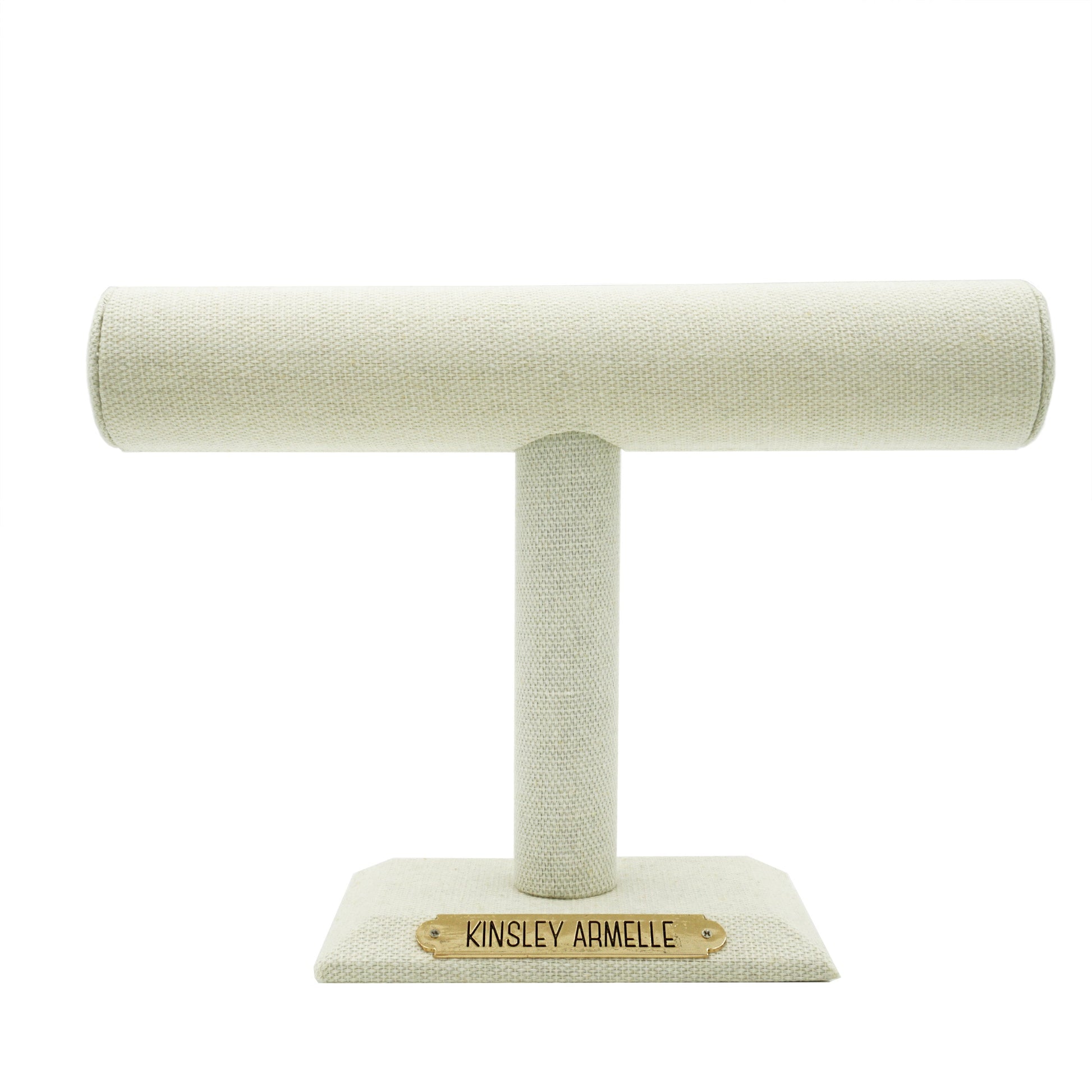 Gold And White Stand Hypoallergenic Nickel Free Jewelry Stand Jewelry Organizer. Custom 18K Yellow Gold Ion Plated Stainless Steel Kinsley Armelle Engraved Plate Accents And Designed With Love In Texas. Size 9 Inches Wide x 7 Inches Tall With Custom Sizing Available On Select Pieces.