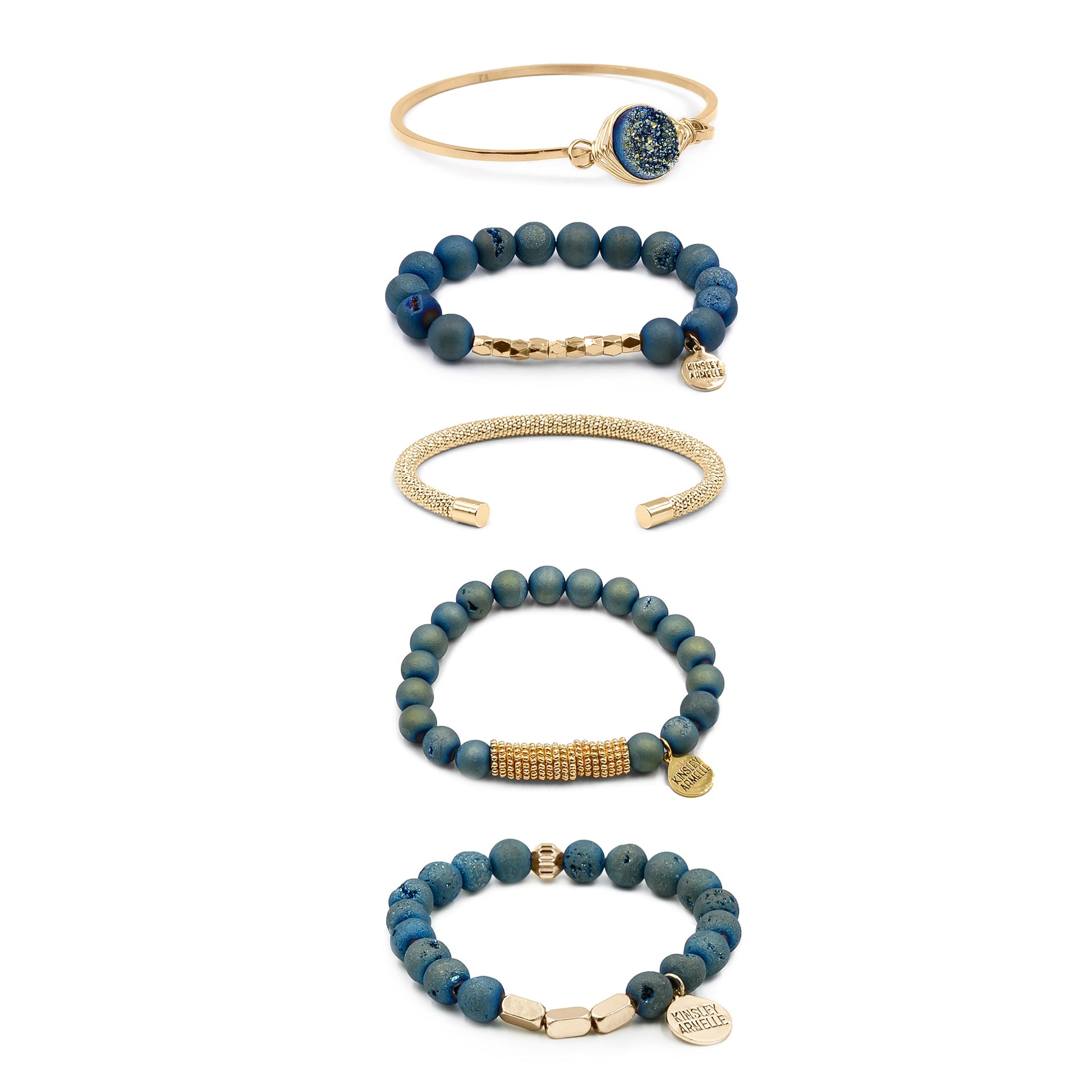 Gold And Blue Beads Faceted Raw Wire Wrapped Hypoallergenic Nickel Free Bracelet Stack Set. Custom Druzy Raw Natural Quartz Stone Accents And Designed With Love In Texas. Size Small, Medium, Large, and Extra Large Ranging From 6.25 - 7.25 Inch Circumference With Custom Sizing Available On Select Pieces.