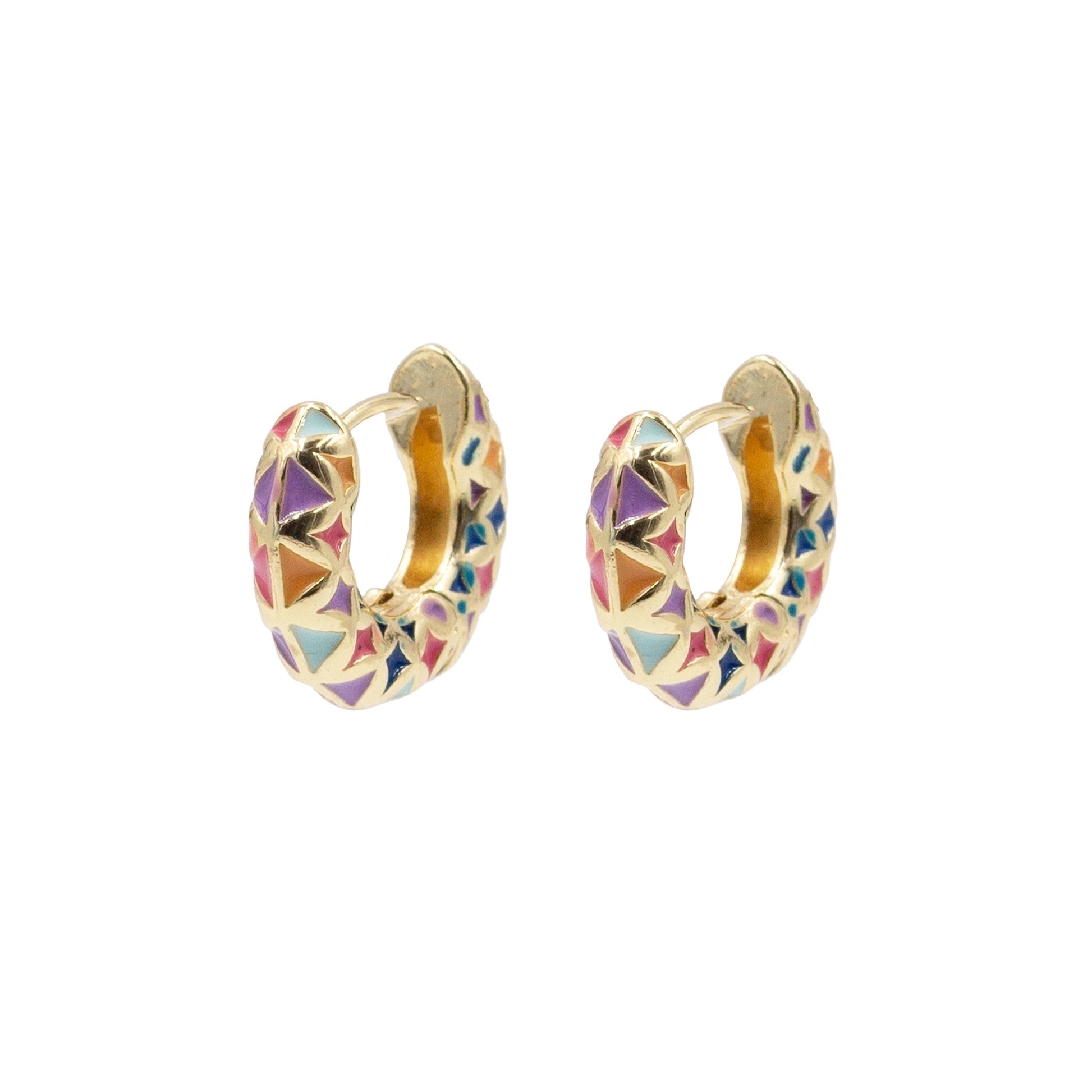 Gold And Orange Blue Hinged Huggie Multicolored Pink Purple Dainty Hoop Earrings. Custom Geometric Shapes Accents And Designed With Love In Texas. Size 0.75 Inches Diameter With Custom Sizing Available On Select Pieces.