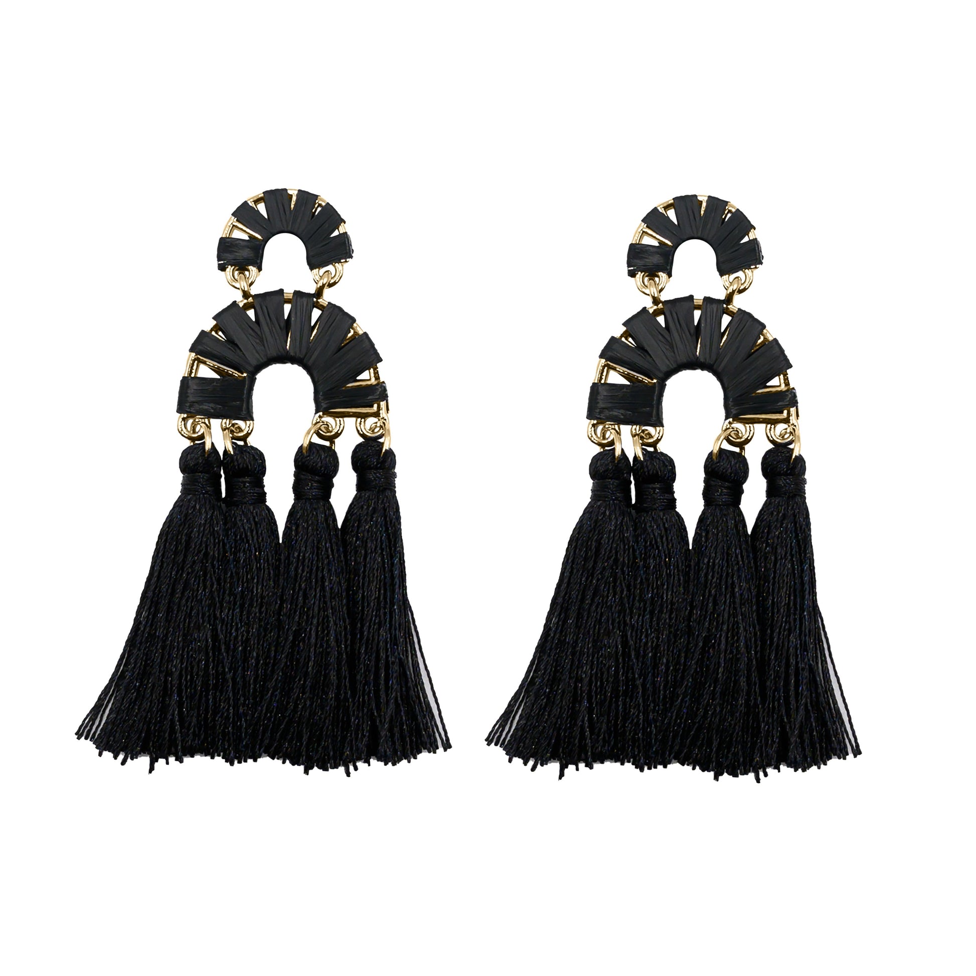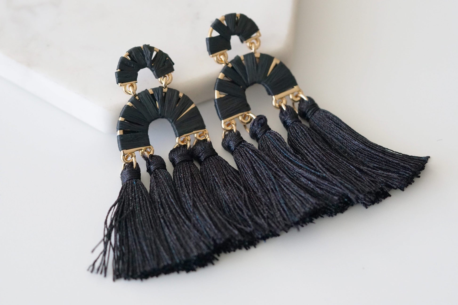 Gold And Black Boho Fringe Rafia Tiered Lightweight Hypoallergenic Nickel Free Statement Drop Earrings. Custom Linen Tassels Accents And Designed With Love In Texas. Size 2.75 Inches Length x 1.0 Inch Width With Custom Sizing Available On Select Pieces.