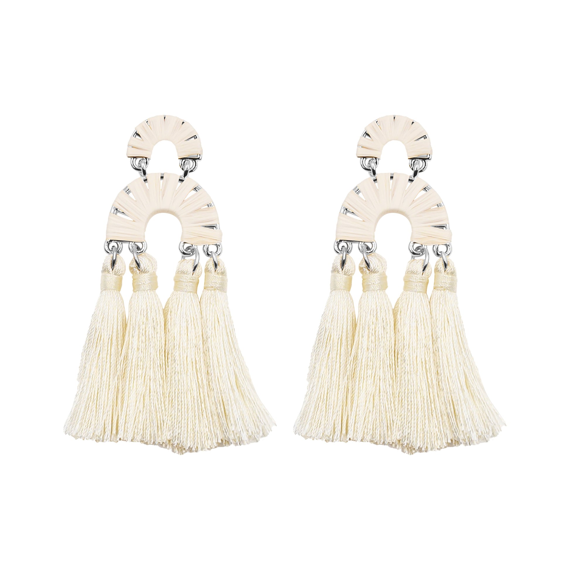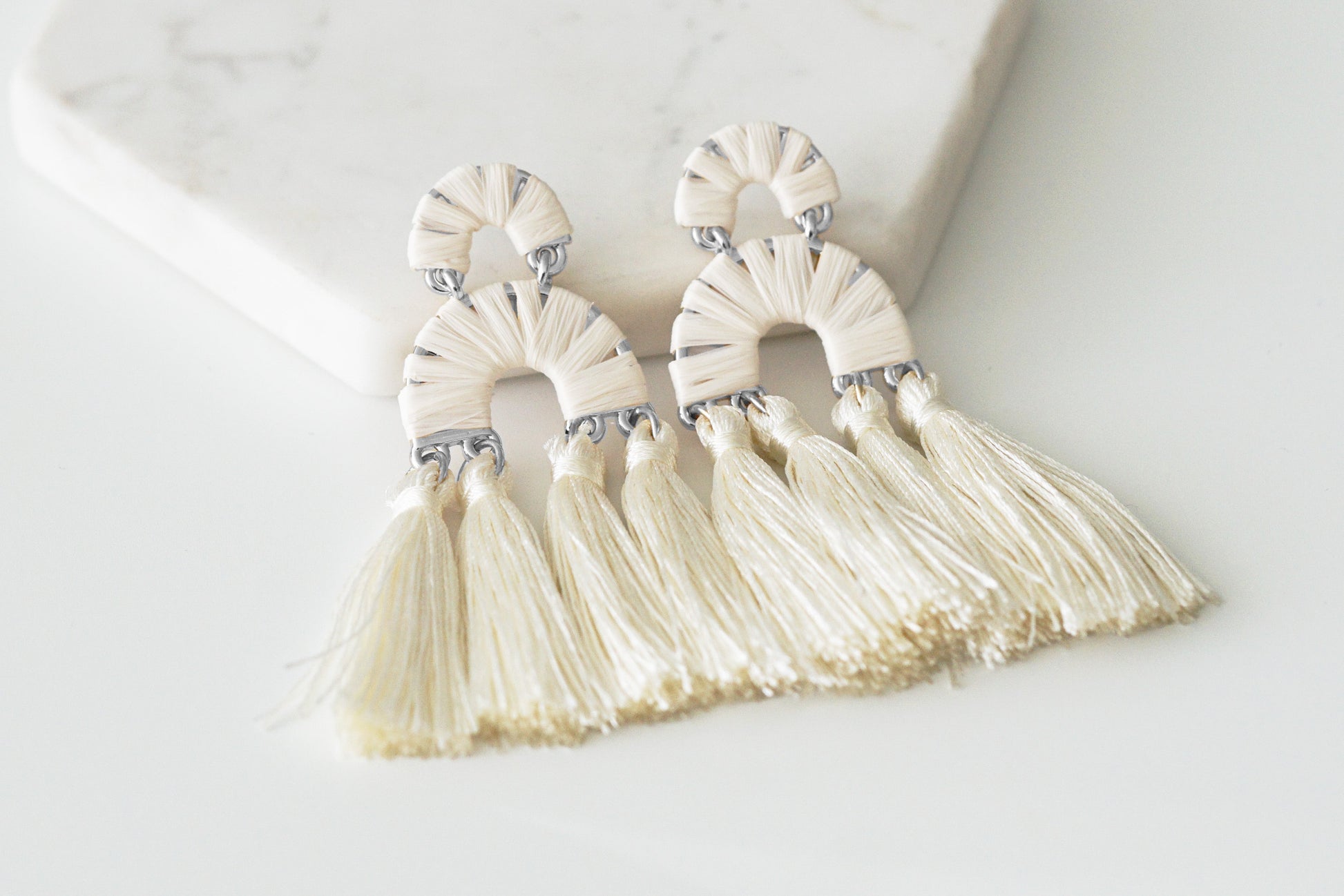 Silver And White Boho Fringe Rafia Tiered Lightweight Hypoallergenic Nickel Free Statement Drop Earrings. Custom Linen Tassels Accents And Designed With Love In Texas. Size 2.75 Inches Length x 1.0 Inch Width With Custom Sizing Available On Select Pieces.