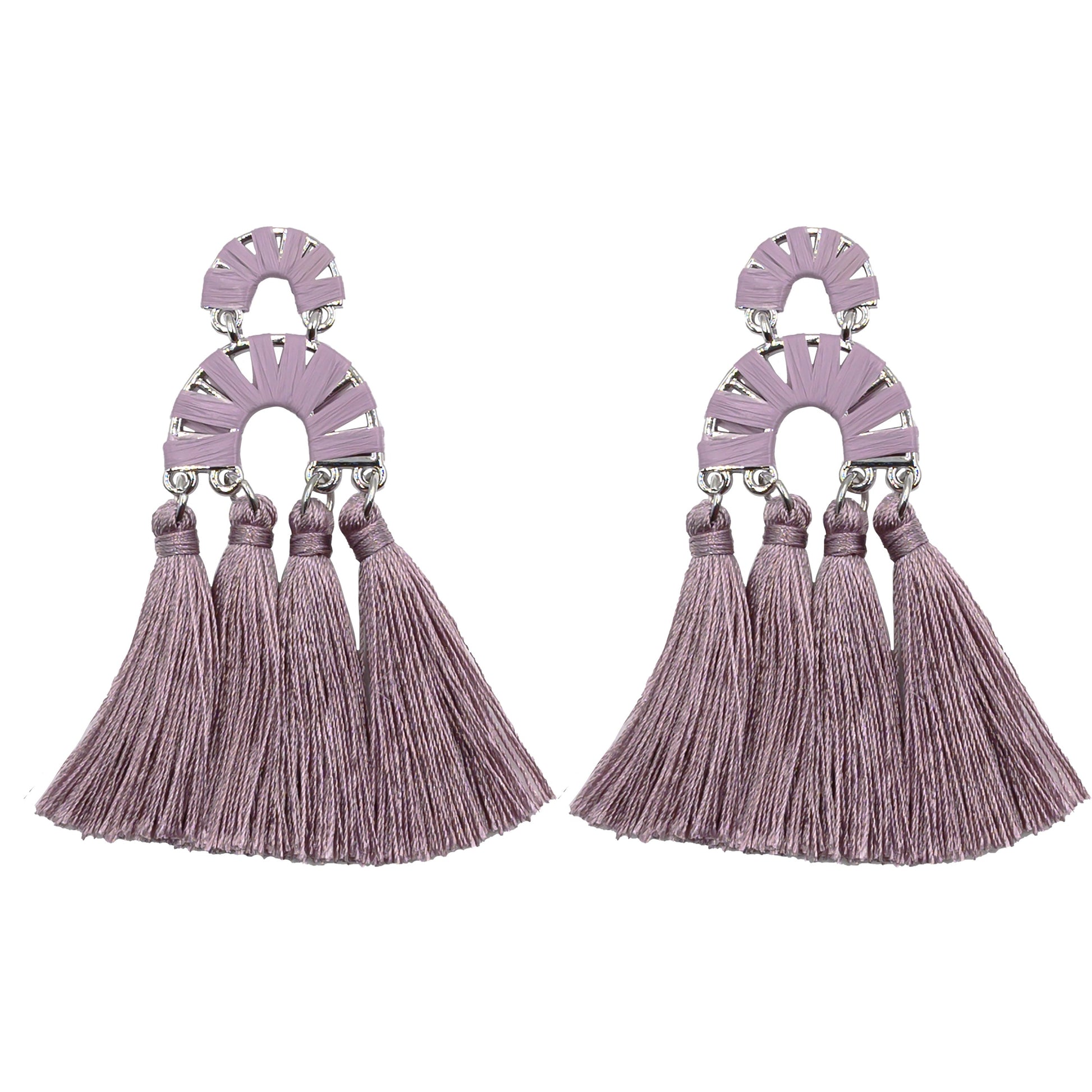 Silver And Purple Boho Fringe Rafia Tiered Lightweight Hypoallergenic Nickel Free Statement Drop Earrings. Custom Linen Tassels Accents And Designed With Love In Texas. Size 2.75 Inches Length x 1.0 Inch Width With Custom Sizing Available On Select Pieces.