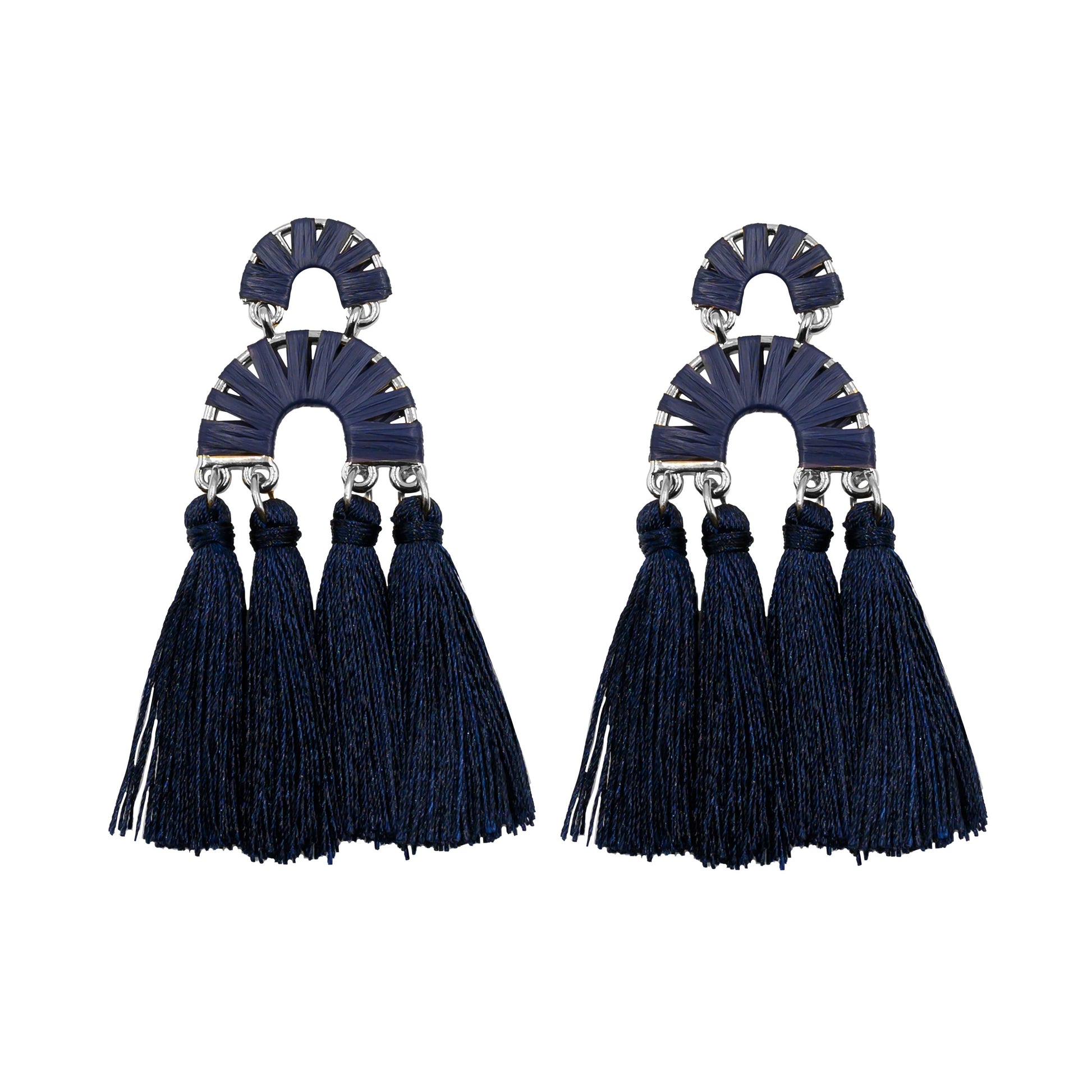 Silver And Blue Boho Fringe Rafia Tiered Lightweight Hypoallergenic Nickel Free Statement Drop Earrings. Custom Linen Tassels Accents And Designed With Love In Texas. Size 2.75 Inches Length x 1.0 Inch Width With Custom Sizing Available On Select Pieces.