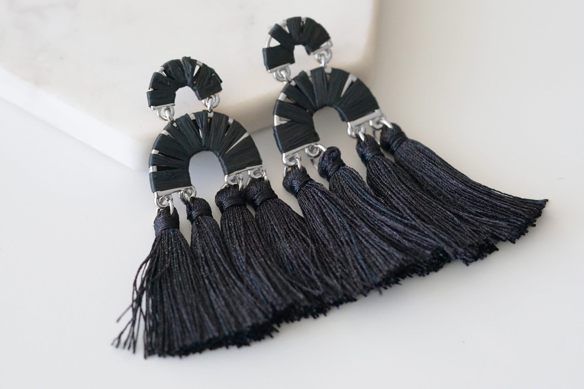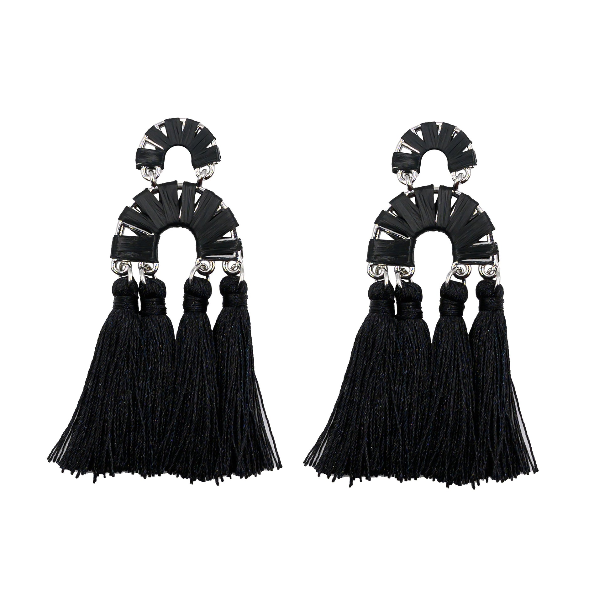 Silver And Black Boho Fringe Rafia Tiered Lightweight Hypoallergenic Nickel Free Statement Drop Earrings. Custom Linen Tassels Accents And Designed With Love In Texas. Size 2.75 Inches Length x 1.0 Inch Width With Custom Sizing Available On Select Pieces.