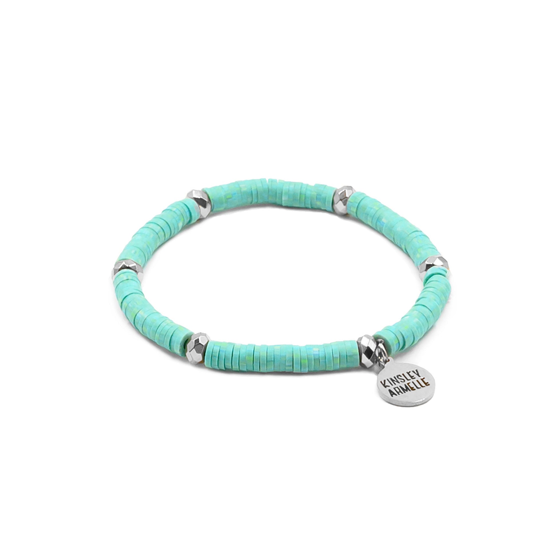 Silver And Light Blue Disc Heishi Station Hypoallergenic Nickel Free Beaded Stretch Bracelet. Custom Decorative Accent Beads Accents And Designed With Love In Texas. Size Small, Medium, Large, and Extra Large Ranging From 6.25 - 7.25 Inch Circumference With Custom Sizing Available On Select Pieces.