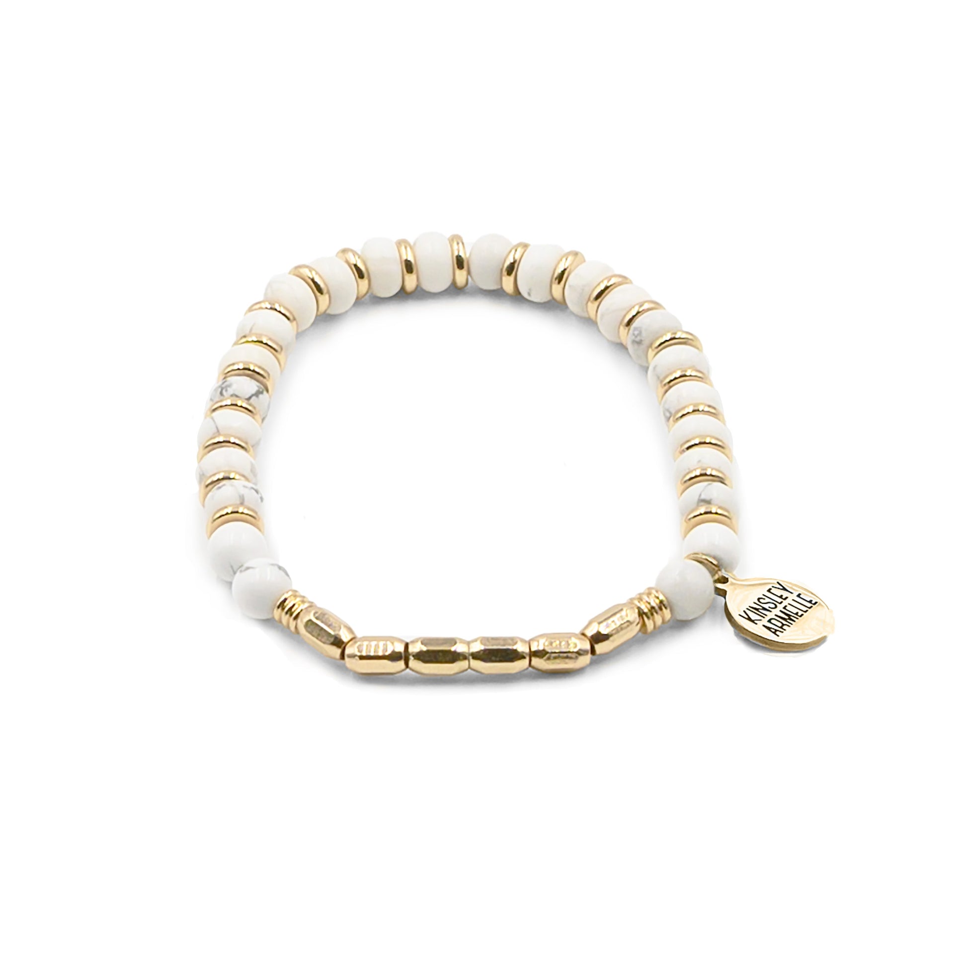 Gold And White Cylindrical Disc Faceted Geometric Natural Stone Hypoallergenic Nickel Free Beaded Stretch Bracelet. Custom Marble Accents And Designed With Love In Texas. Size Small, Medium, Large, and Extra Large Ranging From 6.25 - 7.25 Inch Circumference With Custom Sizing Available On Select Pieces.