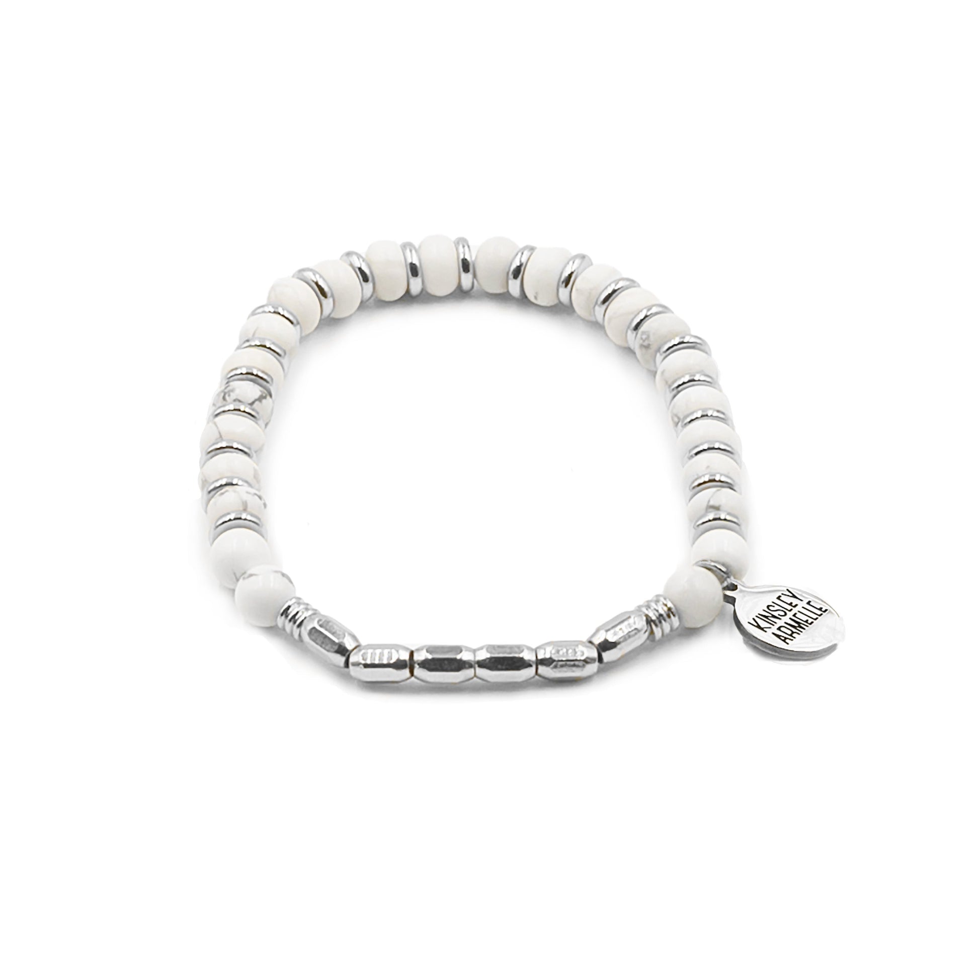 Silver And White Cylindrical Disc Faceted Geometric Natural Stone Hypoallergenic Nickel Free Beaded Stretch Bracelet. Custom Marble Accents And Designed With Love In Texas. Size Small, Medium, Large, and Extra Large Ranging From 6.25 - 7.25 Inch Circumference With Custom Sizing Available On Select Pieces.